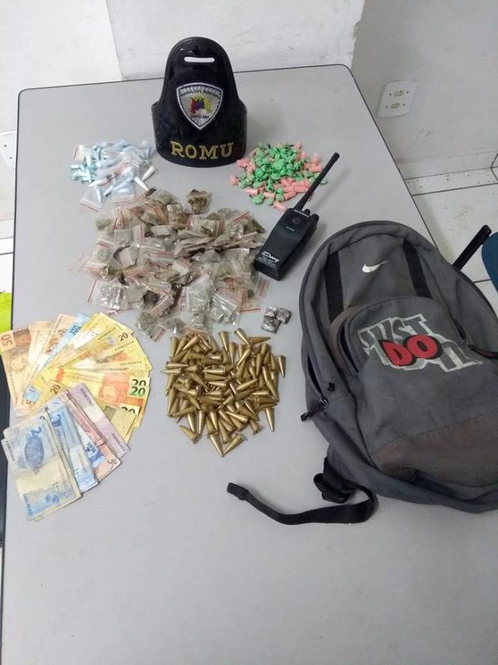 Com L.D.V.S., foram localizados R$ 529, além de 120 porções de maconha, 52 pinos de cocaína, 96 porções de crack e um rádio comunicador. Já com G.S.A., nada foi localizado, porém ele era o “olheiro” do ponto de tráfico.