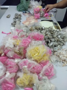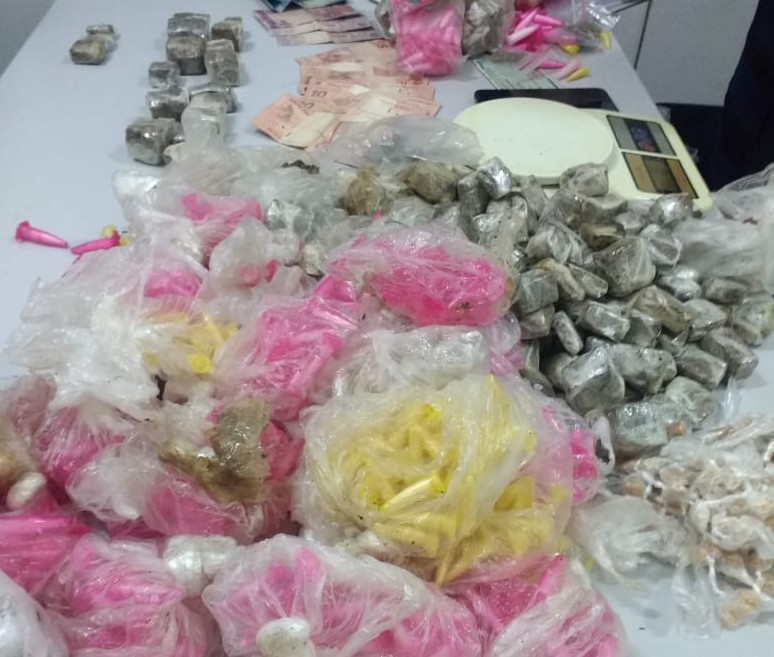 M.A.C., de 19 anos, estava com uma sacola plástica contendo 103 porções de crack, 34 porções de maconha, 125 pinos pequenos de cocaína, 91 pinos grandes de cocaína, R$ 99,00 dinheiro trocado e um celular da marca Samsung. Indagado, M.A.C. informou que saiu da cadeia há 20 dias, onde cumpria pena pelos crimes de tráfico, furto e abandono material. Também disse que estava vendendo drogas no local há uma semana, nos dias de quinta-feira e domingo, com lucro de R$ 1.000,00 mil reais por noite.