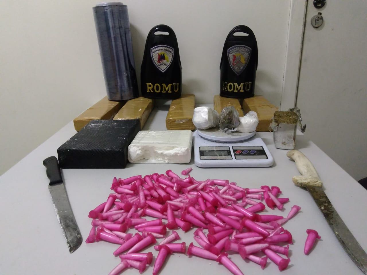 Durante a busca, foram localizadas as drogas no veículo e o acusado ainda admitiu que em sua residência havia mais drogas e materiais para embalo. Foram localizados no imóvel cinco tijolos de maconha e mais um tijolo de cocaína, totalizando 1,8 kg de cocaína e 5 kg de maconha.