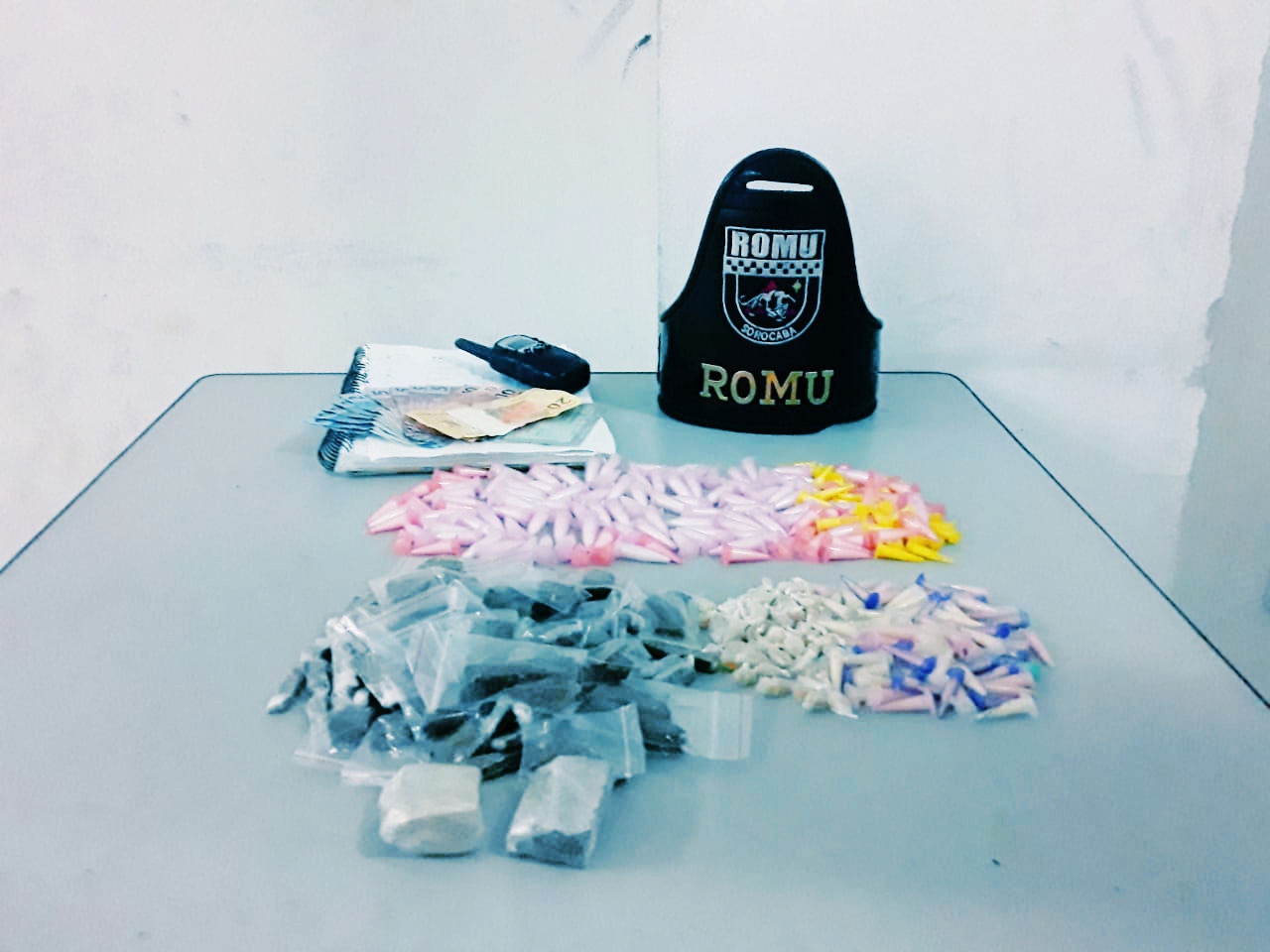 Em revista pessoal feita ao jovem foi encontrada uma pochete contendo um rádio comunicador, oito porções de maconha, 44 porções de cocaína, 19 porções de crack e R$ 87,00. Próximo ao abordado, foi localizada uma mochila contendo mais 105 porções de maconha, 106 porções de crack, 109 porções de cocaína e um caderno com marcações do comércio diário das drogas.