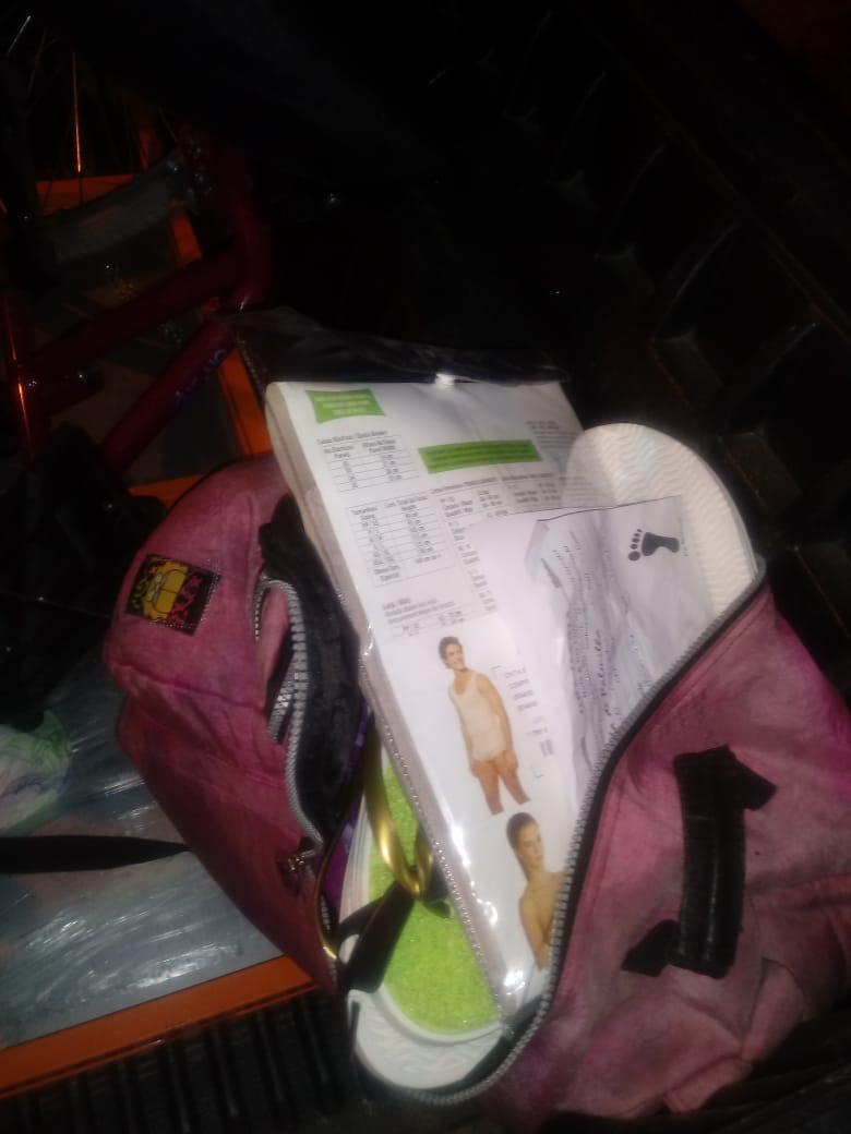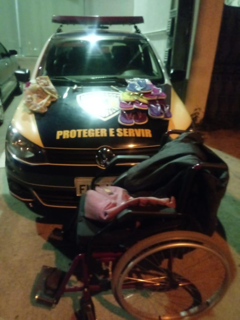 Na abordagem, foi constatado que o homem empurrava uma cadeira de rodas nova e em sua mochila havia uma cinta modeladora feminina e 6 pares de chinelos ortopédicos.