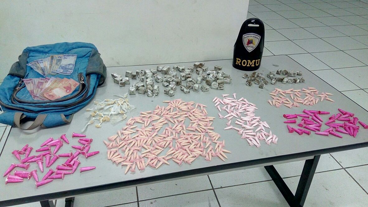 Durante busca pessoal, foi encontrado, com um deles, uma sacola contendo 52 microtubos de crack, 39 microtubos de cocaína e 25 porções de maconha. Já na mochila do outro indivíduo, foram localizados 294 porções de crack, 117 microtubos de cocaína, 73 porções de maconha, além de R$ 79 em dinheiro.