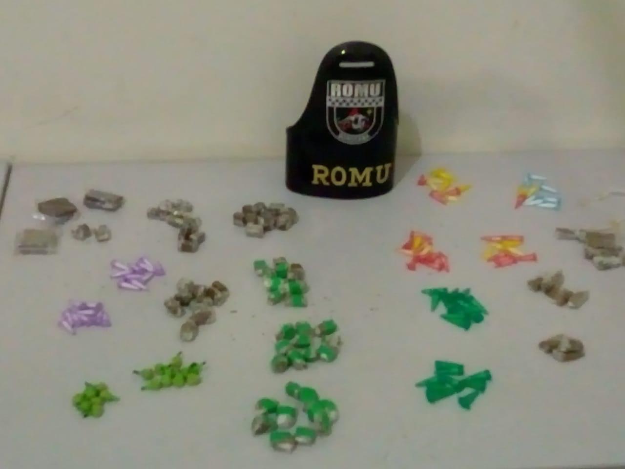 Durante a madrugada desta terça-feira (02), por volta de 1h30, a Ronda Ostensiva Municipal – ROMU -, realizava patrulhamento no Parque das Laranjeiras (Zona Norte) e, ao acessar a rua Manoel Peres, a equipe visualizou um indivíduo que, ao perceber a aproximação da viatura, empreendeu fuga a pé, sendo alcançado e detido na Rua Dirceu Américo, onde os guardas localizaram uma embalagem plástica contendo 07 porções de crack, 22 porções de maconha, 41 porções de cocaína e 19 micro tubos de crack.