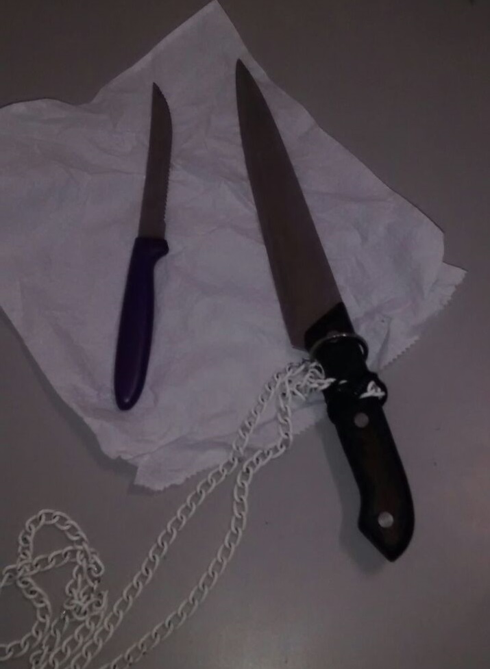 A guarnição procedeu a um patrulhamento nos arredores, vindo a localizar o suspeito juntamente com mais dois rapazes, sendo todos abordados de imediato. Os guardas civis, então, realizaram uma revista pessoal e localizaram com o indiciado duas facas, sendo uma delas, provavelmente, a utilizada como arma do crime.