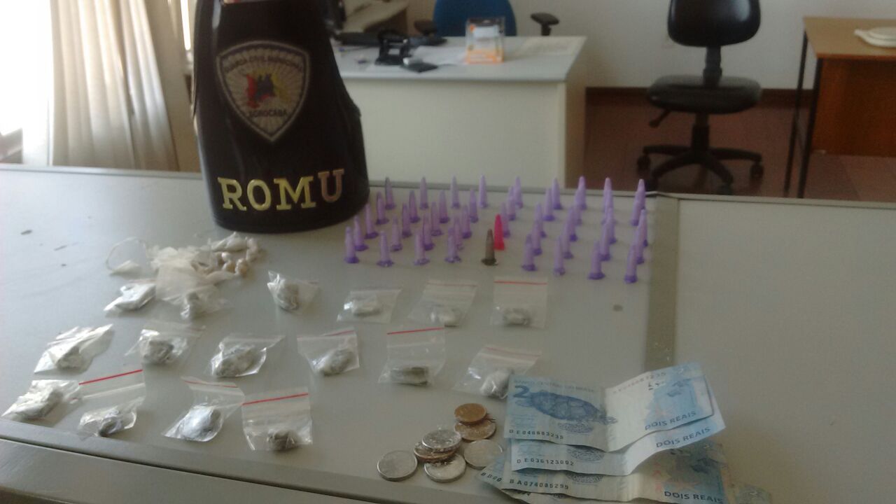 Em revista pessoal ao indivíduo verificou-se tratar de um adolescente 15 anos de idade que trazia consigo a quantia de R$ 10,00 no bolso e, em averiguação na sacola dispensada, foram encontradas 16 porções de maconha, 17 porções de crack, 45 microtubos de cocaína e R$ 2,60 em moedas.
