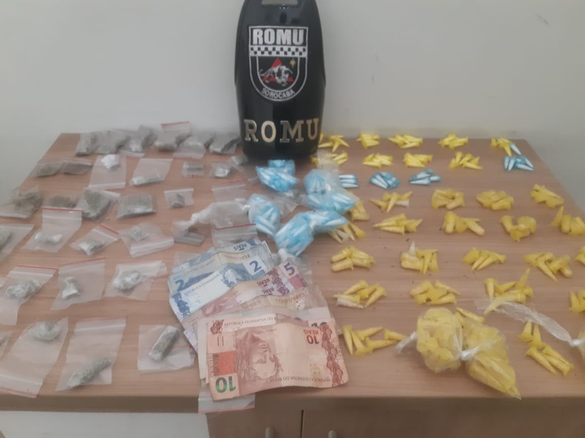 De acordo com a ocorrência, a viatura percorria pelo bairro quando nas proximidades da unidade escolar avistou um indivíduo saindo da residência com uma sacola na mão. O homem, ao perceber a aproximação da viatura tentou retornar rapidamente, mas foi abordado. Durante a revista os GCMS perceberam que M.V.O.S., de 19 anos, possuía em sua sacola 163 porções de cocaína, 177 porções de crack, 43 porções de maconha e R$ 70,00 em diversas notas.