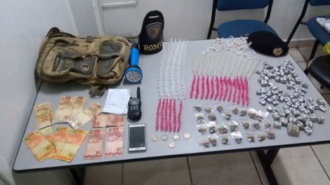 Ao realizar uma revista pessoal no suspeito, foram encontrados em sua mochila 119 porções de maconha, 289 pinos com cocaína, 163 porções de crack, uma quantia de R$315,00 em notas diversas, além de um rádio comunicador HT.