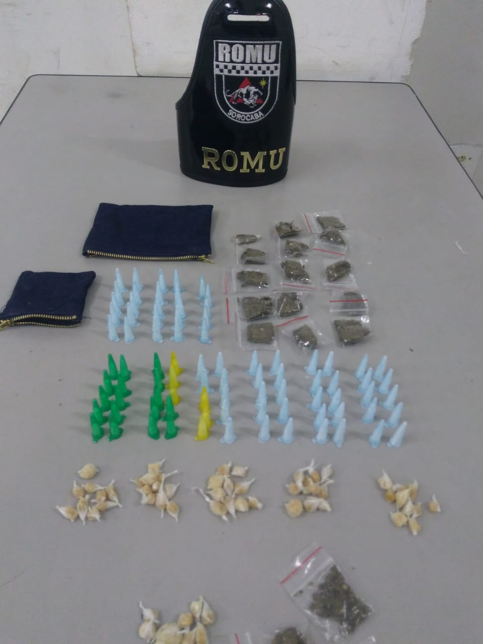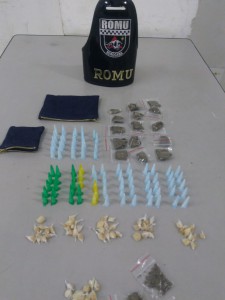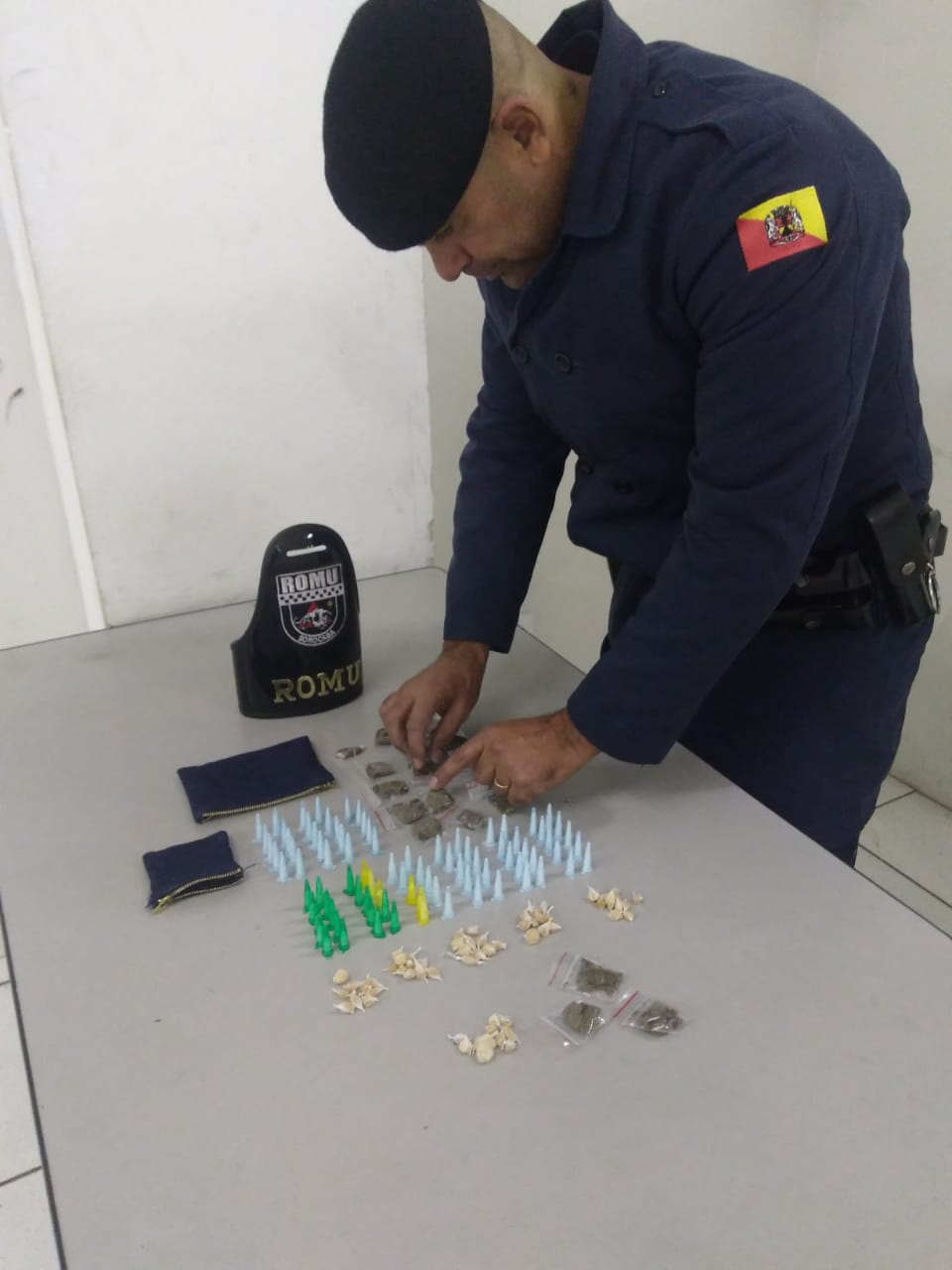Com as informações, os guardas foram até o local para averiguar, onde avistaram o indivíduo com as características passadas. Realizado a abordagem, em revista pessoal com A.B.M. foi localizado em sua blusa 06 porções de cocaína, 03 porções de maconha e 09 porções de crack.