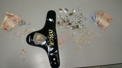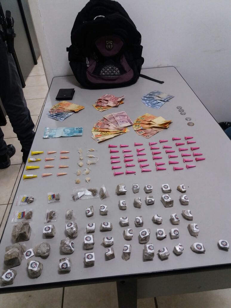A guarnição abordou o suspeito metros à frente. Já detido, o mesmo disse ser menor de 18 anos e assumiu estar vendendo drogas. Em sua mochila, foi encontrado 51 porções de maconha, 18 porções de crack e 45 pinos de cocaína.