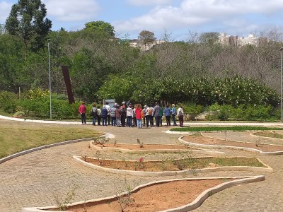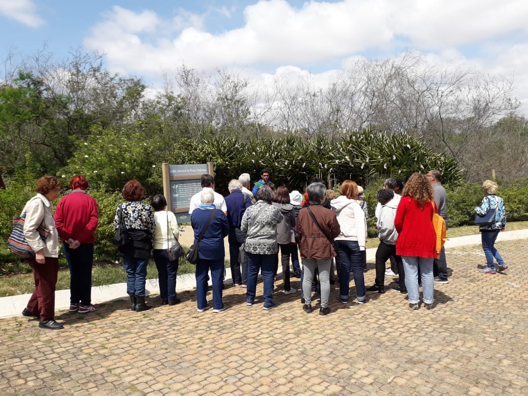 Outro atrativo apresentado ao grupo foi o Jardim Sensorial de Plantas Medicinais, que ocupa uma área de 150 metros quadrados, no formato do símbolo do infinito, e é composto por diversas espécies de plantas. O espaço foi projetado também com o objetivo de aguçar os sentidos a partir dos estímulos oferecidos pelas texturas, formas e aromas presentes em cada elemento que compõe o jardim.