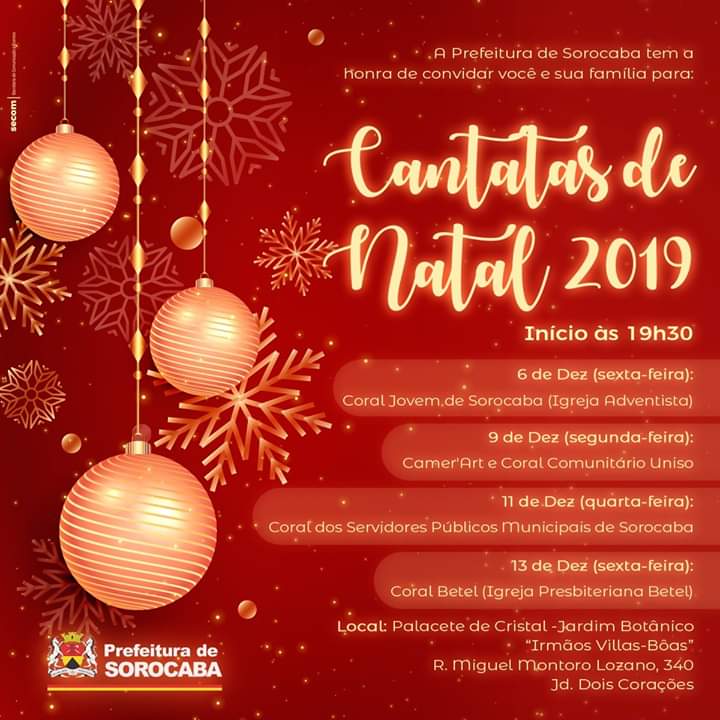 Acontece nesta sexta-feira (13), a última apresentação do evento Cantatas de Natal 2019 do Jardim Botânico “Irmãos Villas-Bôas” de Sorocaba. O evento é uma iniciativa da Secretaria de Meio Ambiente, Parques e Jardins, com apresentações gratuitas e abertas ao público.