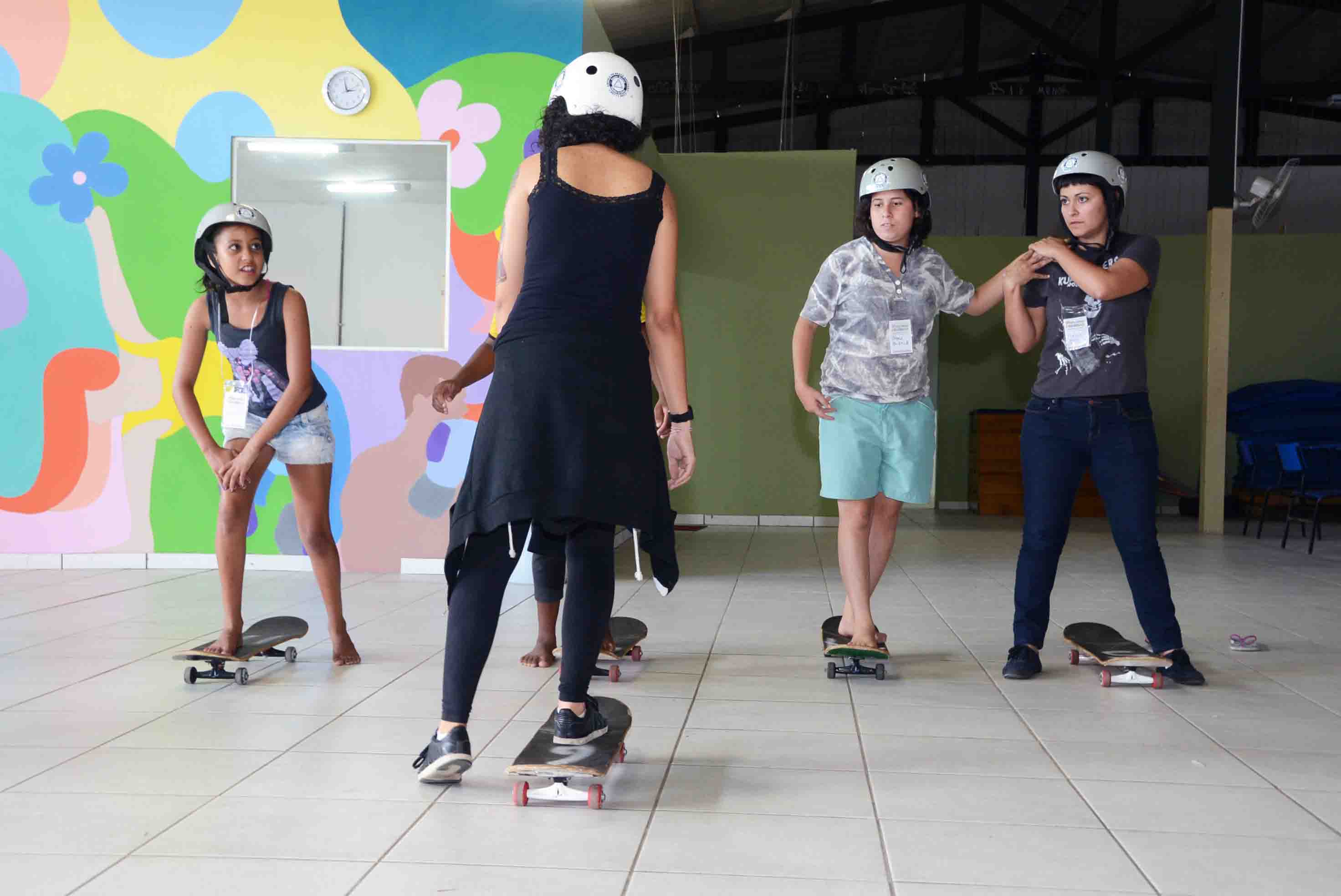 Devidamente equipadas com capacete, nesta primeira aula as garotas sorocabanas aprenderam os primeiros passos para andar num skate. Após um alongamento, Bia ensinou exercícios rápidos para elas aprenderem a subir e descer do skate, técnicas para se equilibrar e ainda alguns cuidados para não cair. “Não queremos formar nenhuma profissional. Aqui o skate é utilizado como um objeto de empoderamento das meninas, mostrando para elas que se elas treinarem é possível andar de skate”, explicou.