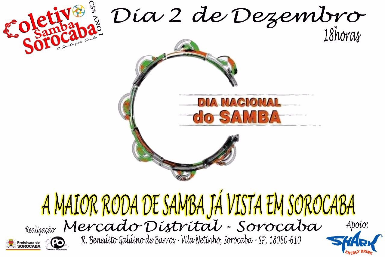 Na comemoração do Dia Nacional do Samba, o Mercado Distrital – mantido e administrado pela Prefeitura de Sorocaba, por meio da Secretaria de Abastecimento e Nutrição (Seaban) – recebe neste sábado (02) um evento musical com o Coletivo Samba Sorocaba, a partir das 18h, com entrada gratuita ao público interessado.