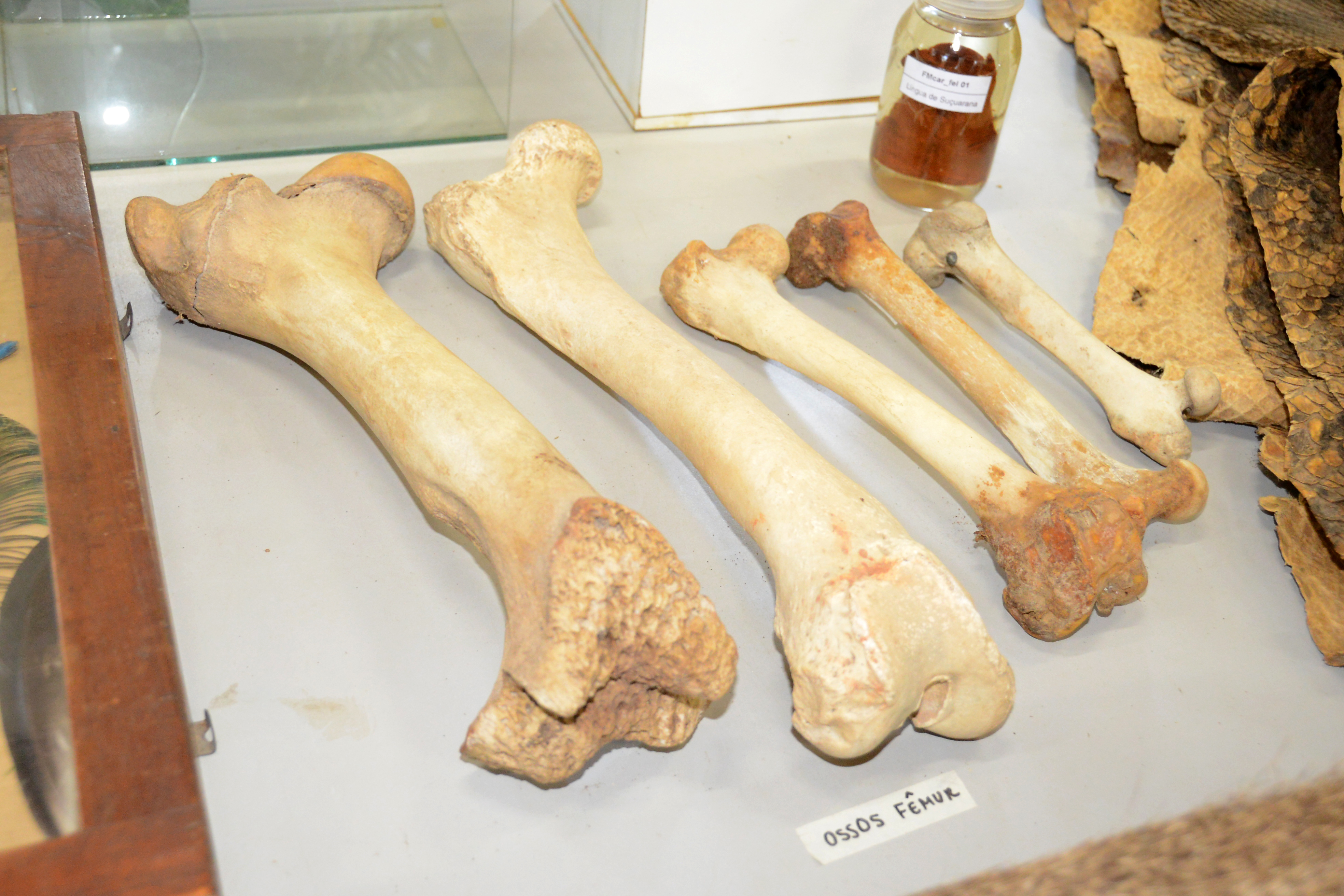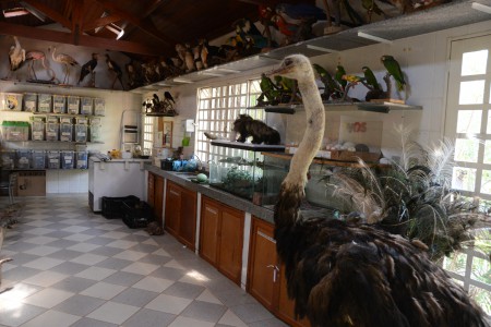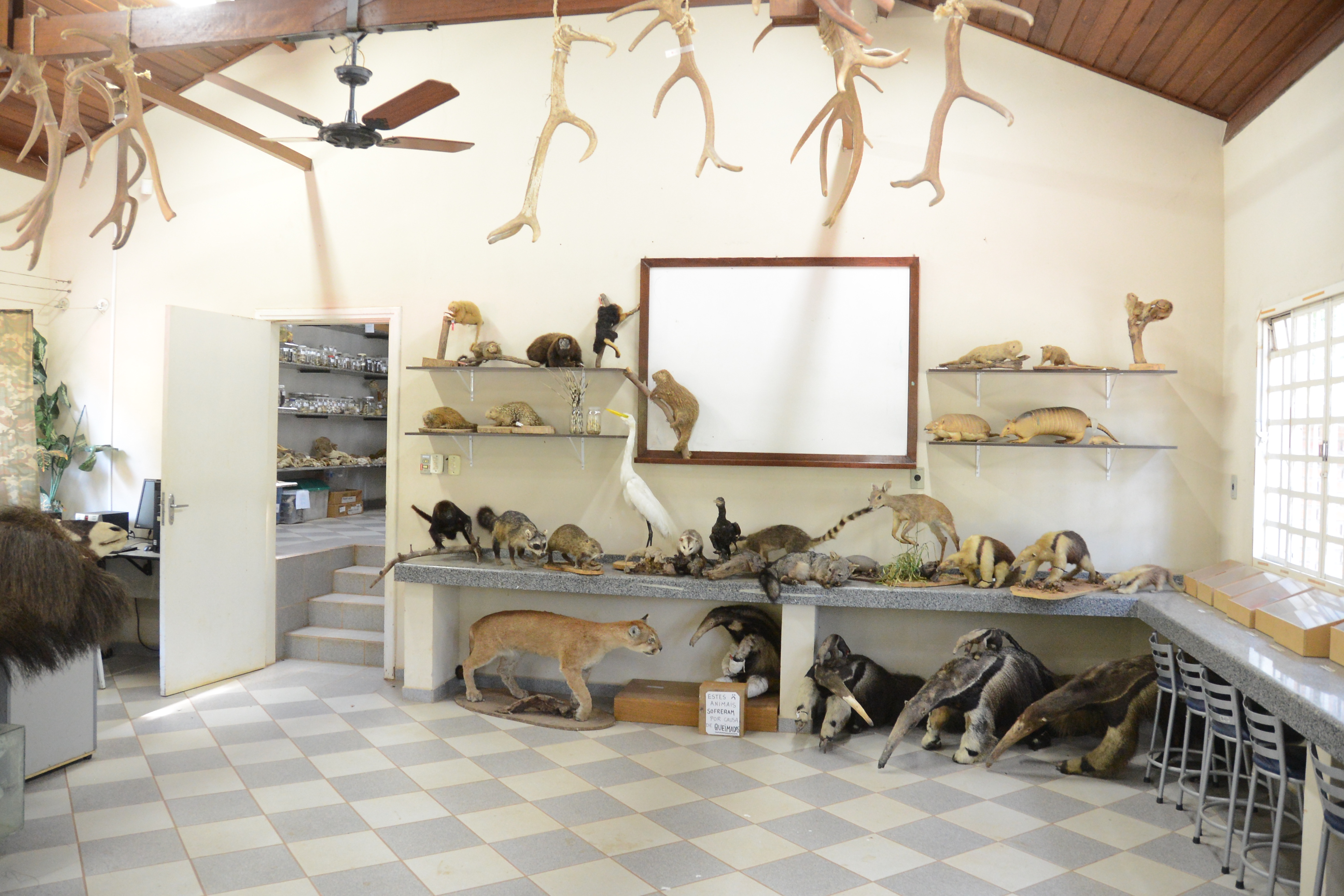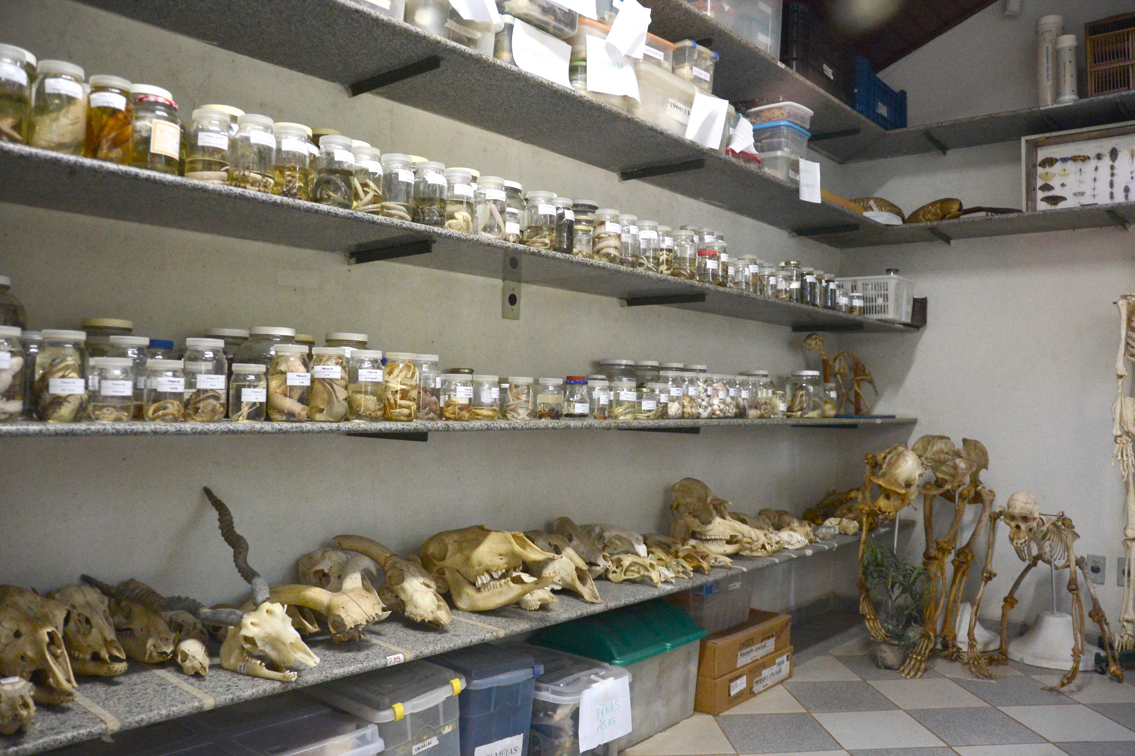 Entre as peças expostas estão a onça-parda, aves de todos os tipos, pinguim, iguana, a onça-pintada e avestruz, além de crânios, pele de animal, ninho, espinho de ouriço e animais fixados em álcool, preservados dentro de um pote de vidro.