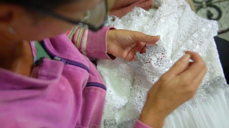 A artesã Denise Cristina de Almeida já foi casada, tem quatro filhos, mas está ansiosa porque é a primeira vez que ela usará o vestido de noiva em cerimônia. O noivo, Geovane, morava perto da casa dela, os dois começaram a conversar e, quando se deram conta, estavam fazendo planos de uma vida em conjunto. Ela é uma das noivas que pegaram emprestado vestido recebido pelo FSS por meio de doação. “Toda mulher sonha com isso, casamento é um passo muito importante e, para mim, casar de branco simboliza a paz entre o casal”, contou animada. Denise fez os últimos ajustes no vestido, que ganhou renda nova nas mangas e na gola, além de pérolas no corpete. Ela também confeccionou o próprio buquê: “É um dia especial e quero brilhar”.