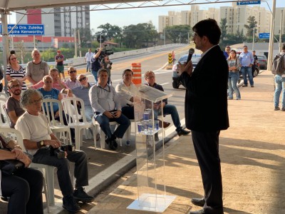 Foram 12 meses de muito trabalho para a realização desta grande obra do sistema viário na região Sul de Sorocaba, sobre o km 101 da rodovia Raposo Tavares. O viaduto Zuleika Sucupira Kenworthy, que liga a rua João Wagner Wey com a região alta do bairro Campolim, foi inaugurado nesta quinta-feira (30). O prefeito José Crespo e o secretário de Mobilidade Acessibilidade que também é presidente da Urbes, Luiz Alberto Fioravante, comandaram a cerimônia que contou com a presença de Elza Mônica de Oliveira Kenworthy Bittencourt, sobrinha de Zuleika, representantes municipais, do Poder Judiciário e do Legislativo, além dos responsáveis pela obra.