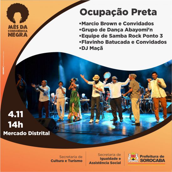 Com o objetivo de oferecer atividades culturais à população, será realizado neste sábado (4), às 14h, o evento “Ocupação Preta” no Mercado Distrital, em comemoração ao Dia da Consciência Negra (20 de novembro). A ação é promovida pela Prefeitura de Sorocaba, por meio da Secretaria de Assistência e Igualdade Social, Secretaria da Cultura e Turismo e Secretaria de Abastecimento e Nutrição.