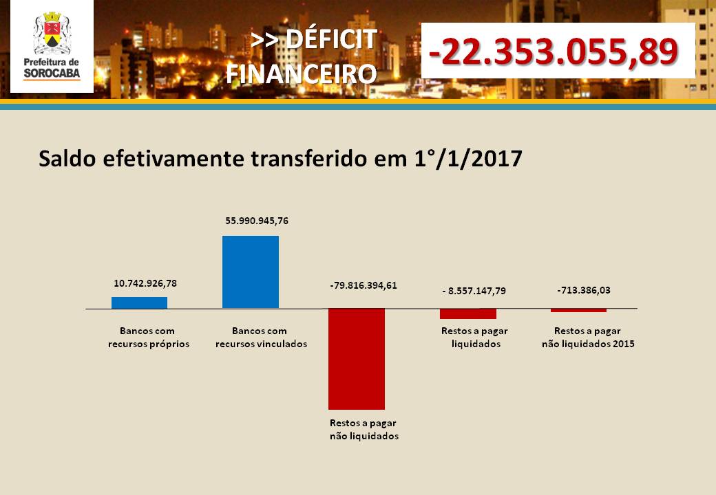 “A administração anterior deixou um saldo devedor de R$ 22.353.055,89, mais um déficit orçamentário de R$ 173.173.733,89, ou seja, o governo passado previu valores abaixo do que custa para manter serviços e produtos”, afirmou o secretário da Fazenda, Fábio Martins, um dos integrantes da operação.