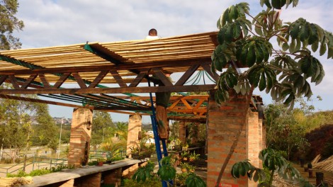Antes de serem colocados, os novos bambus receberam tratamento e foram envernizados para aumentar a sua vida útil. Na última quinta-feira (16), a equipe retirou todos os bambus antigos e nesta sexta-feira (17) começaram a colocar a nova cobertura. As varas são amarradas uma a uma.
