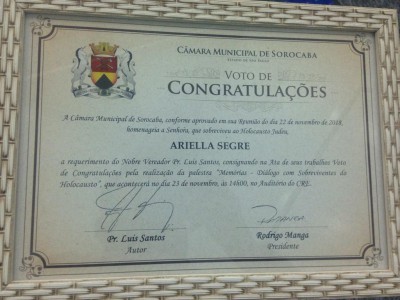 A sobrevivente do holocausto, Ariella Segre, realizou uma comovente palestra na última sexta-feira (23) no auditório do Centro de Referência em Educação (CRE). A palestrante contou como foi a vivência num dos períodos mais sombrios da história da humanidade e relatou momentos de sua infância e a trajetória familiar para concretizar sua sobrevivência.