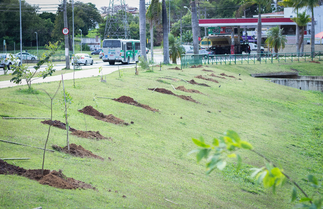 Para o plantio, a equipe de Gestão Ambiental da Secretaria do Meio Ambiente providenciou toda a estrutura necessária, desde a preparação dos berços, transporte e seleção das mudas do viveiro do Parque Natural “Chico Mendes”, até a utilização de tutores e insumos.
