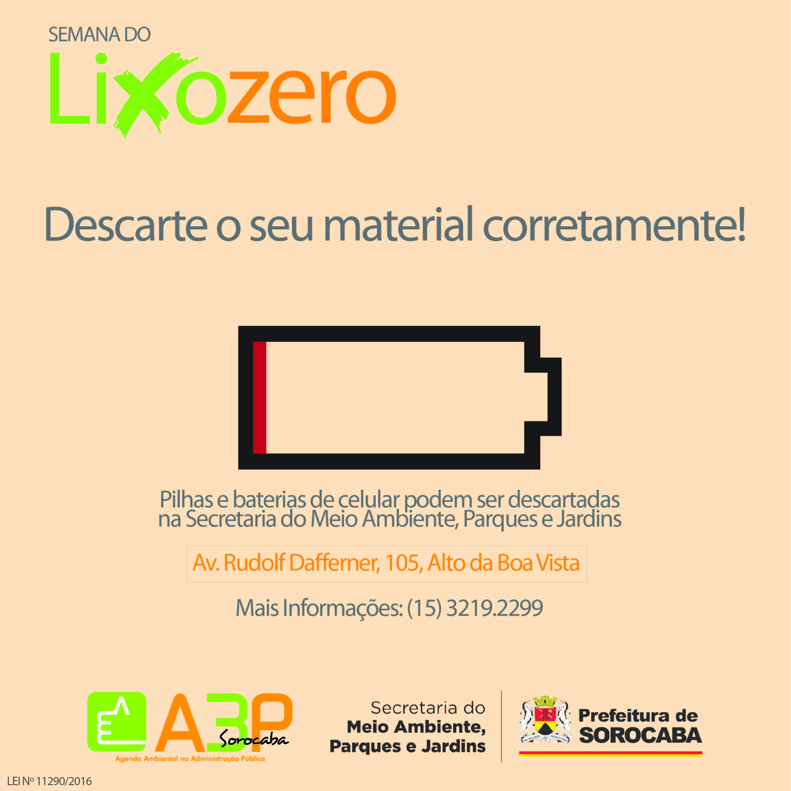 Seguindo com a programação da Semana Municipal do Lixo Zero, em função ao Dia Municipal do Lixo Zero comemorado dia 30 de maio, conforme institui a lei municipal nº 11.290/2016, a Secretaria do Meio Ambiente, Parques e Jardins estimula o descarte correto de pilhas e baterias.