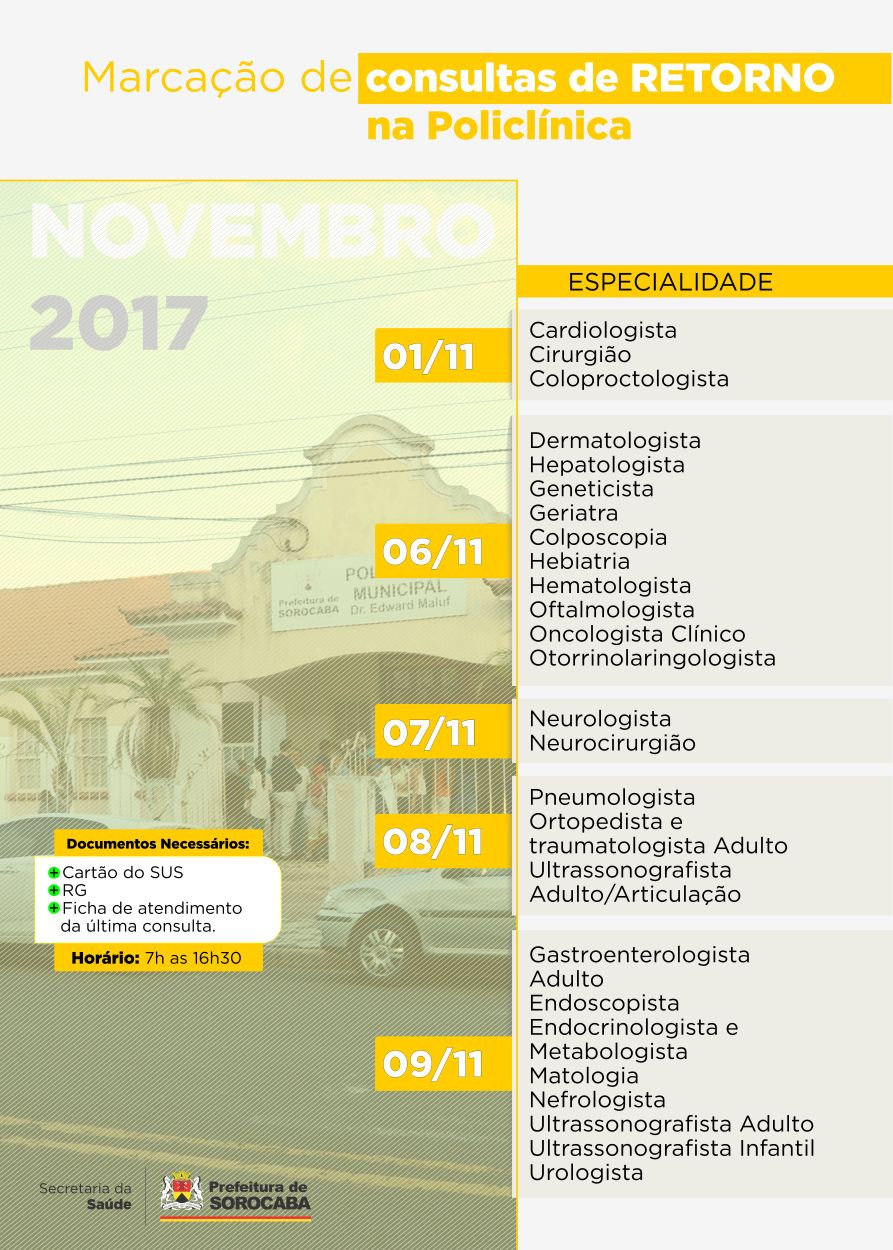 Com o objetivo de otimizar e organizar os agendamentos de consultas à população, a Secretaria da Saúde, por meio da Coordenação da Policlínica, divulga hoje (20) as novas datas para o mês de novembro. O atendimento de marcação das consultas de retorno aos pacientes será realizado nos primeiros cinco dias úteis e divididas por especialidades.