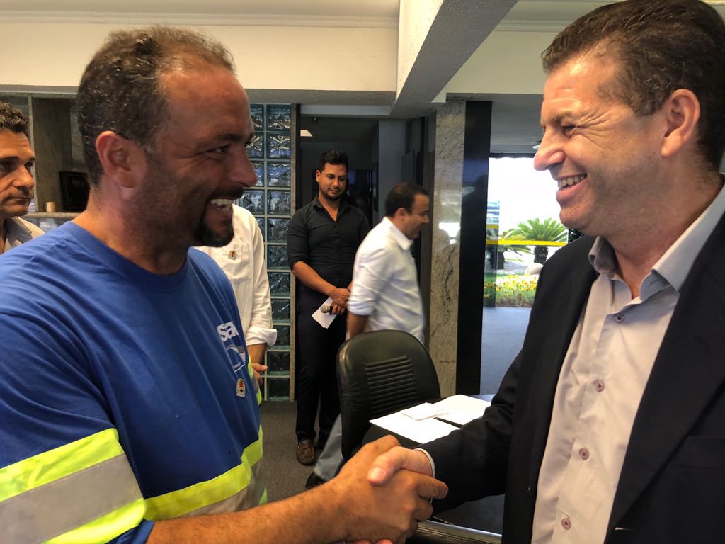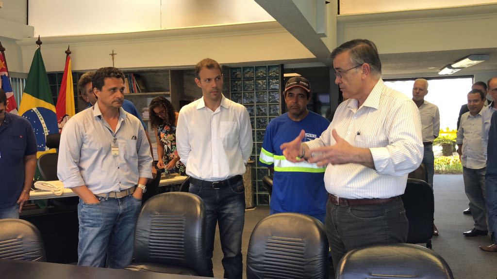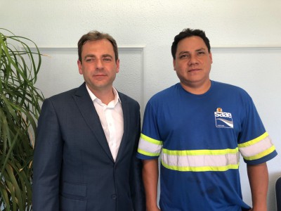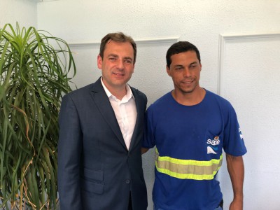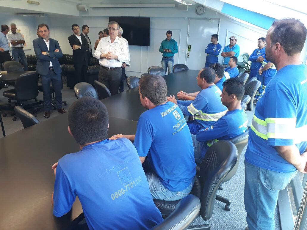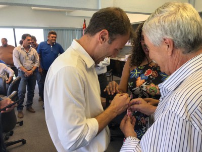 O prefeito José Crespo prestou homenagens aos trabalhadores que, na semana passada, solucionaram em poucas horas o vazamento na principal adutora que transporta água da Serra de São Francisco para a Estação de Tratamento de Água (ETA) no Cerrado. A cerimônia foi realizada no gabinete do próprio prefeito, ao meio-dia desta segunda-feira (5). Na ocasião, os pouco mais de 20 profissionais que atuaram diretamente neste caso receberam um broche com o brasão de Sorocaba, habitualmente utilizado por autoridades que representam o município em eventos externos.