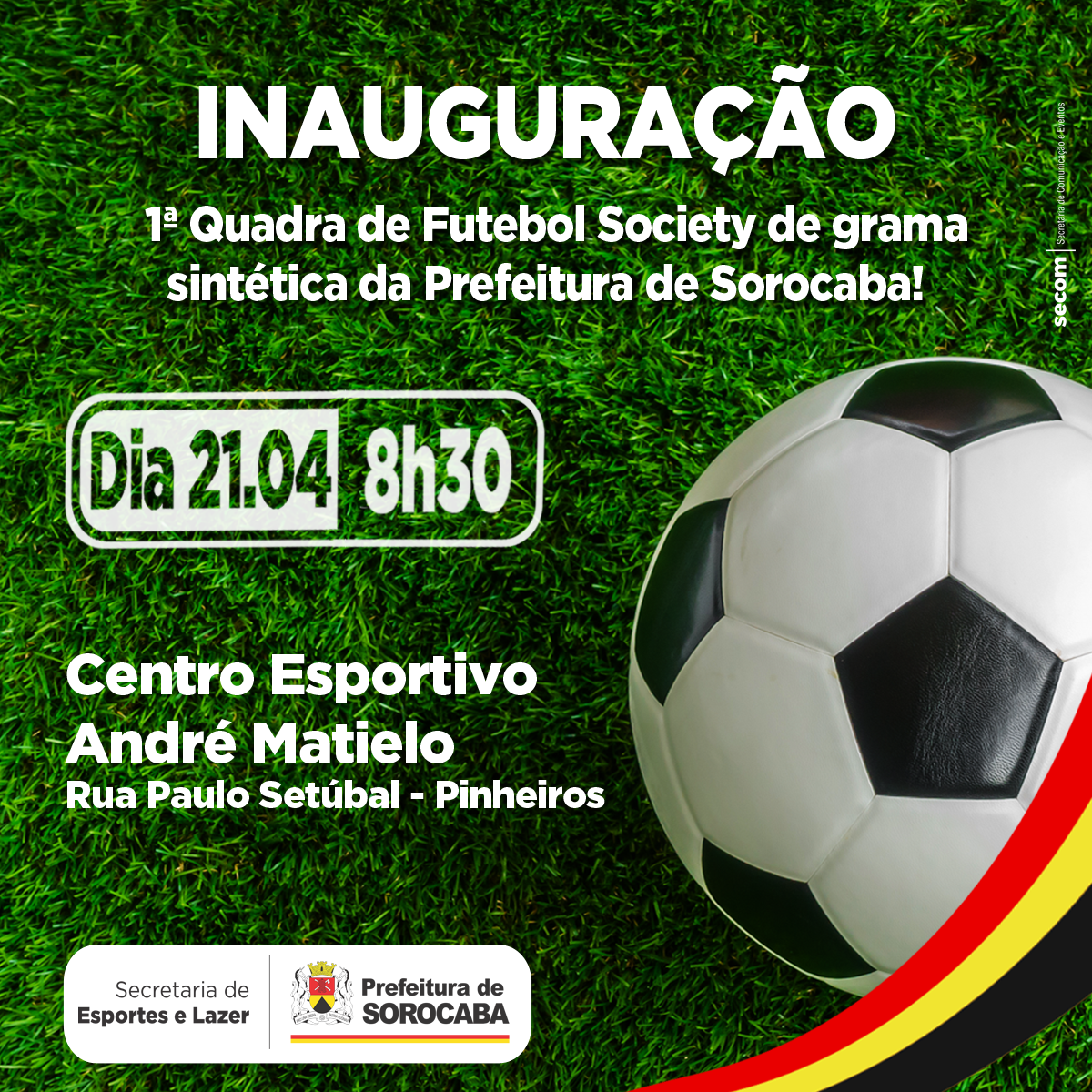 Sorocaba avança cada vez mais na área esportiva. Dessa vez, o prefeito José Crespo inaugura, junto a primeira-dama e presidente do Fundo Social de Solidariedade (FSS), Lilian Crespo, e do secretário de Esportes e Lazer (Semes), a 1ª Quadra de Futebol Society, construída pela prefeitura de Sorocaba. O evento acontece neste sábado (21), às 8h30, no Centro Esportivo “André Matiello”.