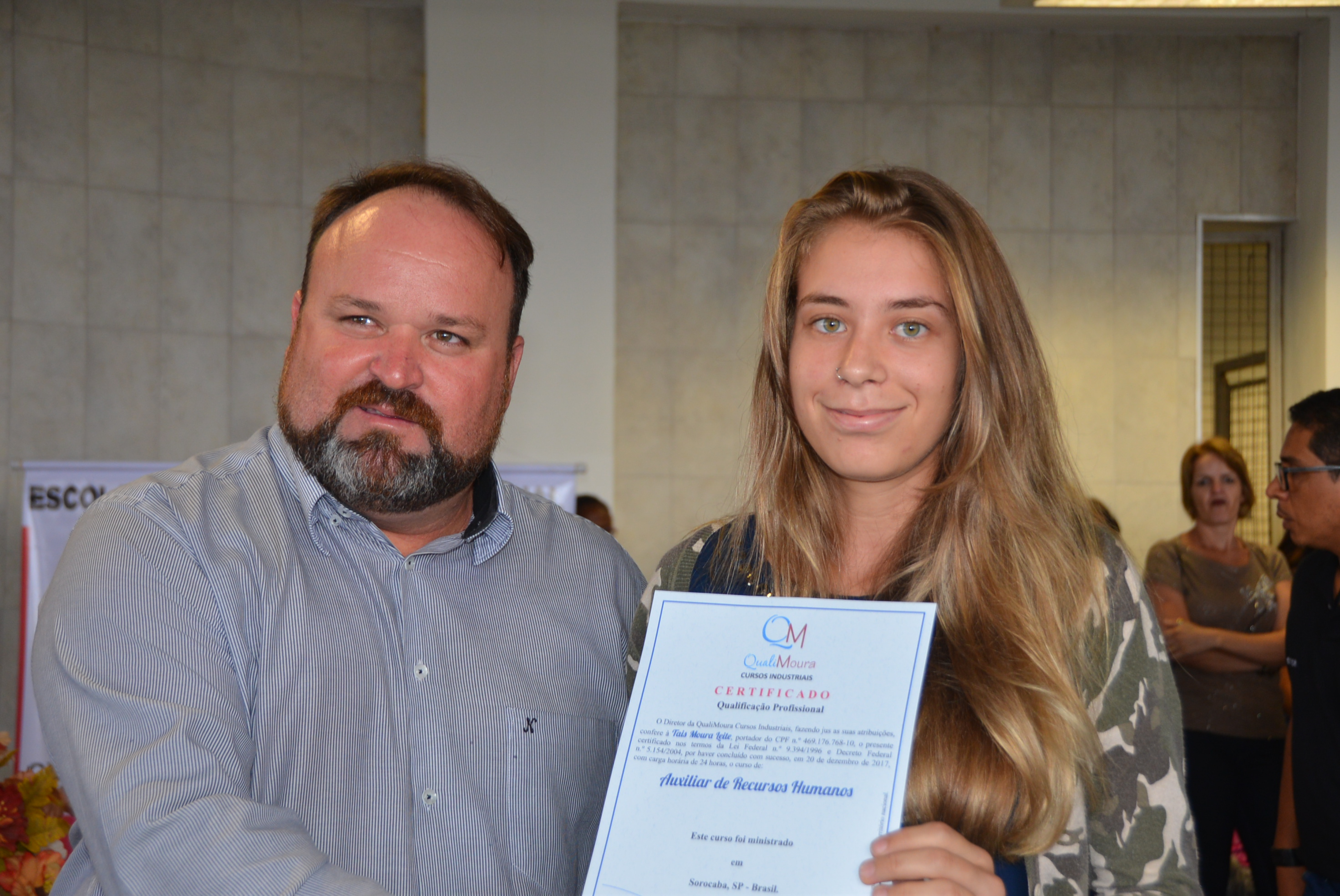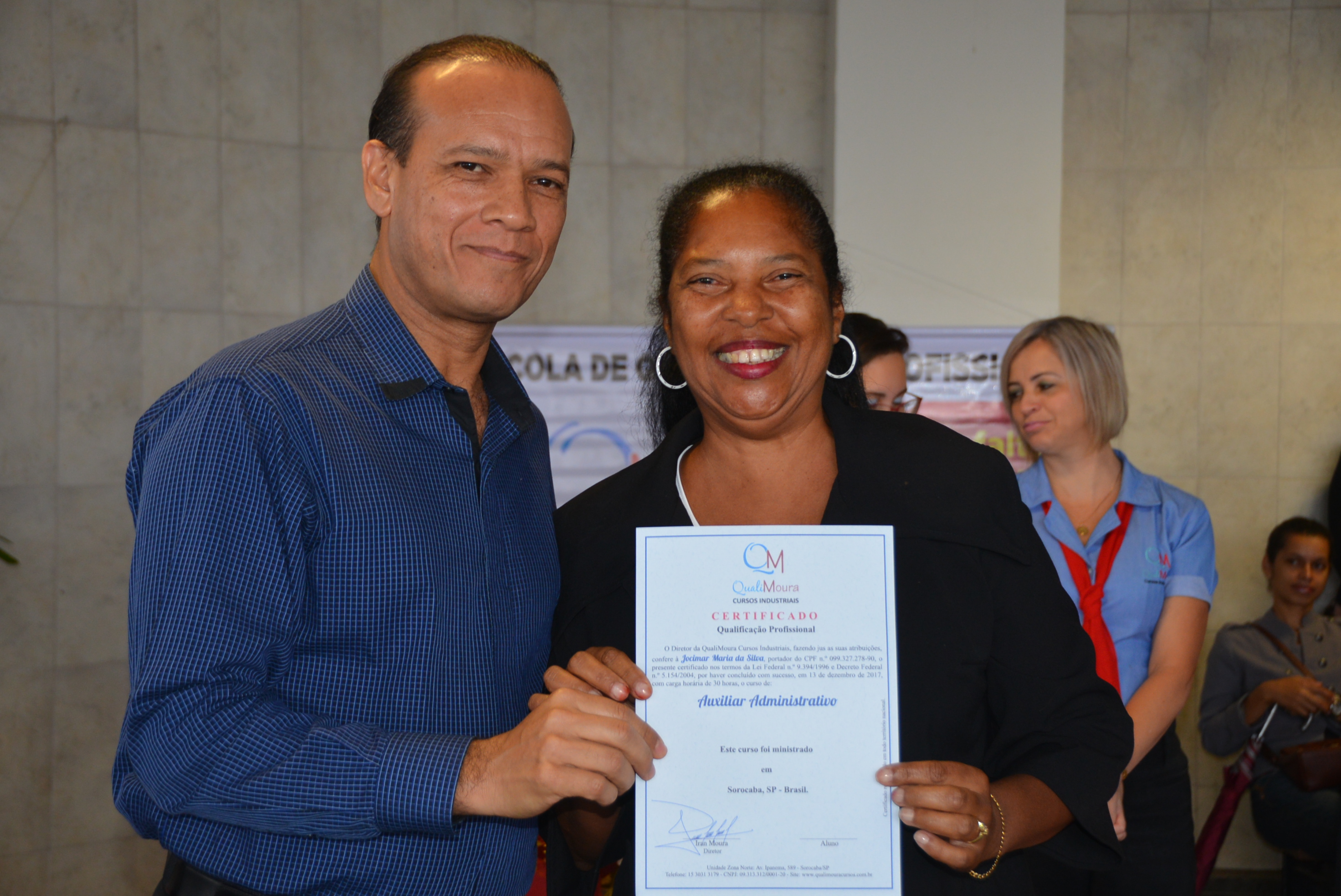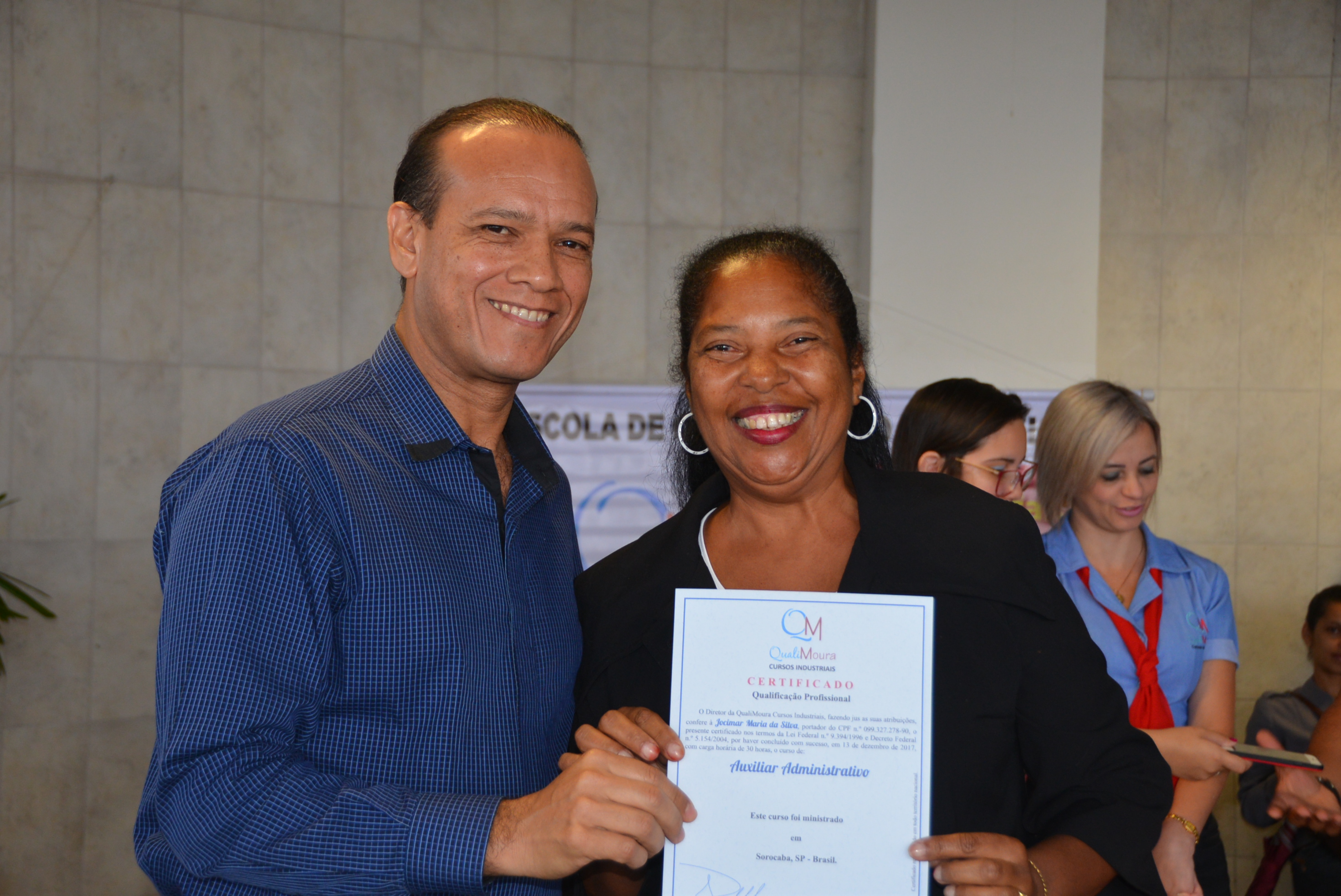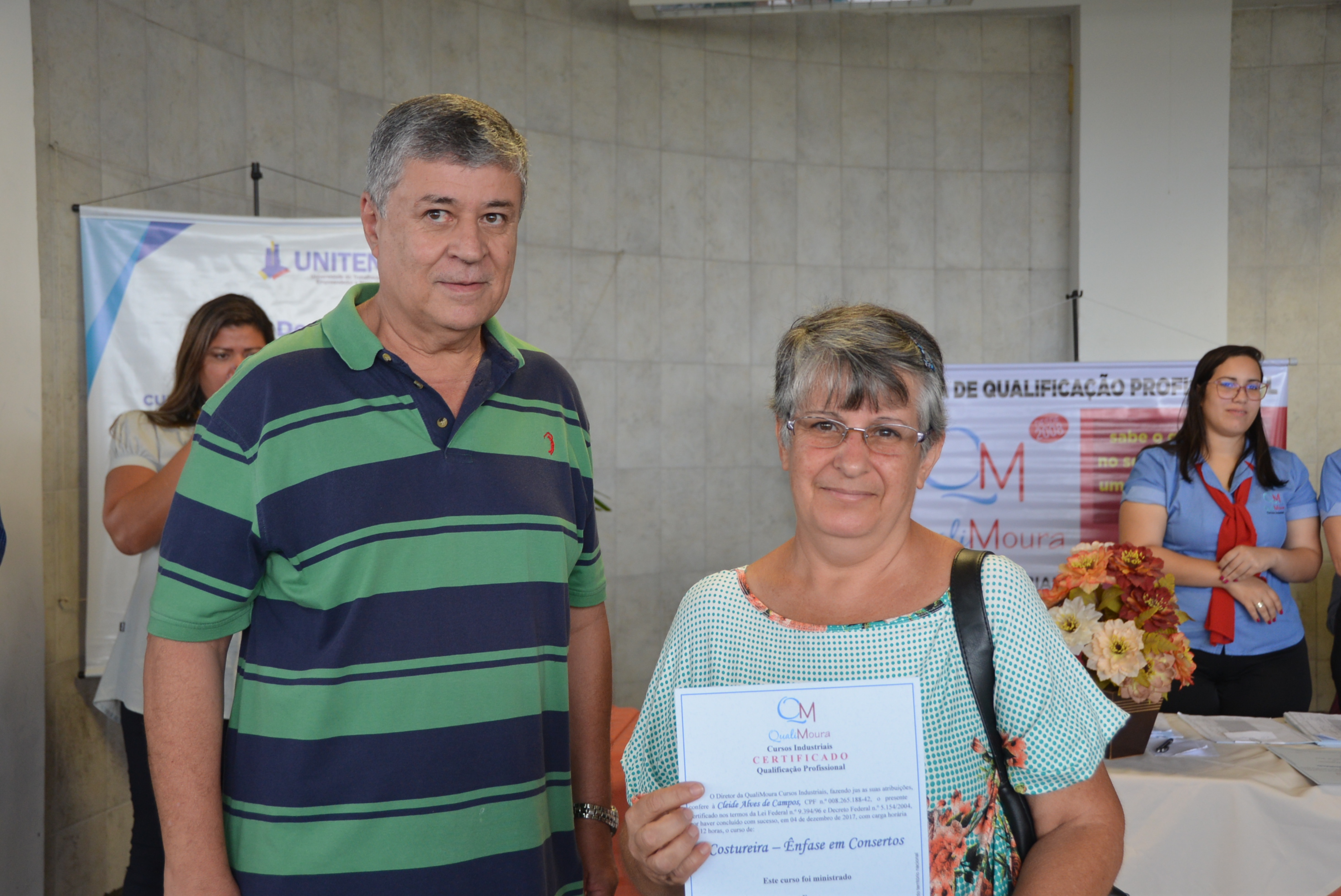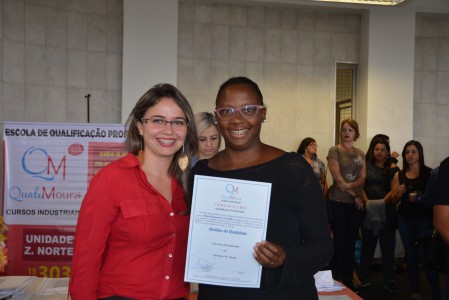 Os certificados foram entregues aos alunos dos cursos de Auxiliar Administrativo, Auxiliar em Logística, Auxiliar de Recursos Humanos, Auxiliar de Qualidade, Auxiliar de Costura, Operador de Caixa, Vendas e Atendimento ao Cliente, Segurança do Trabalho e Equipamento de Proteção Individual.