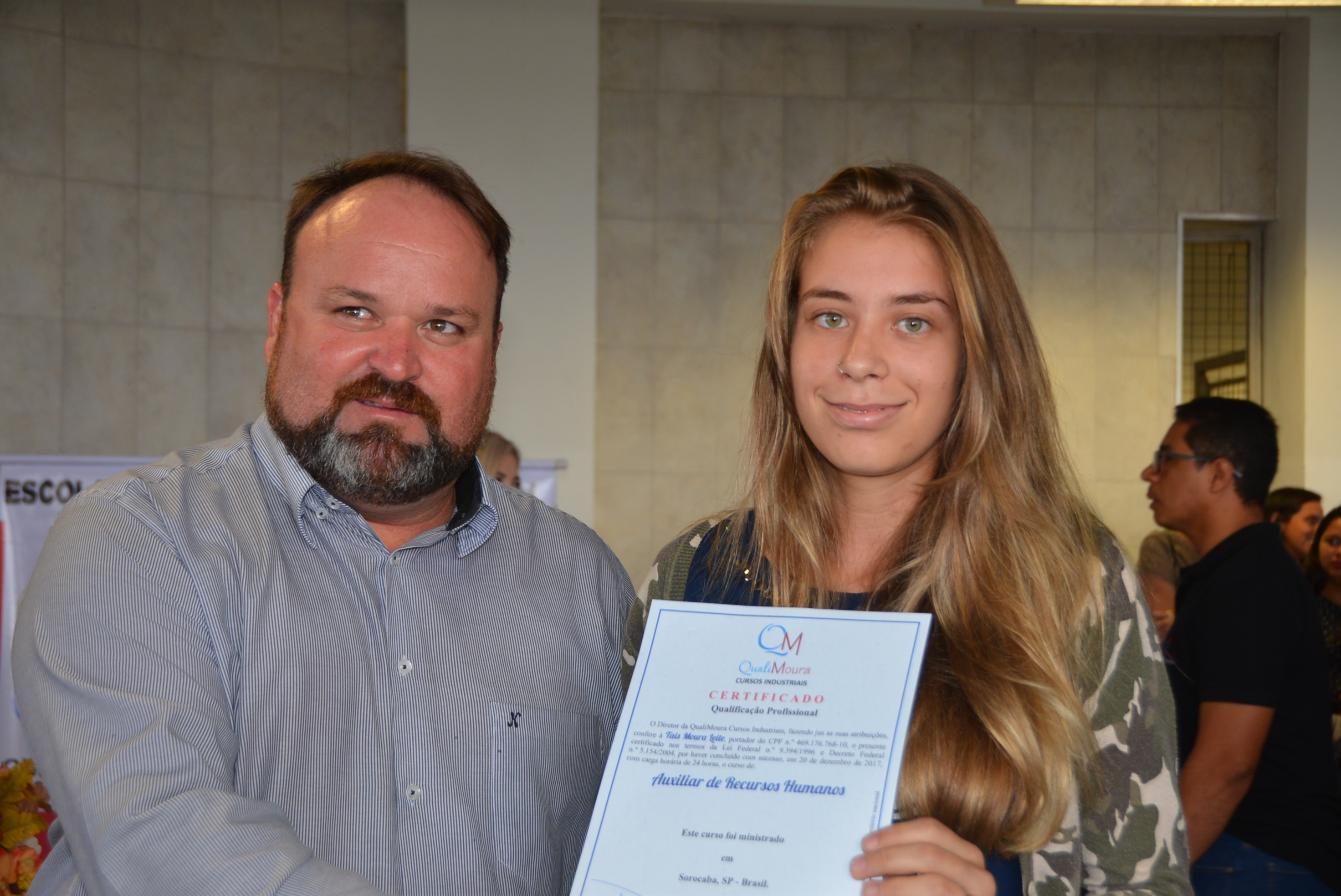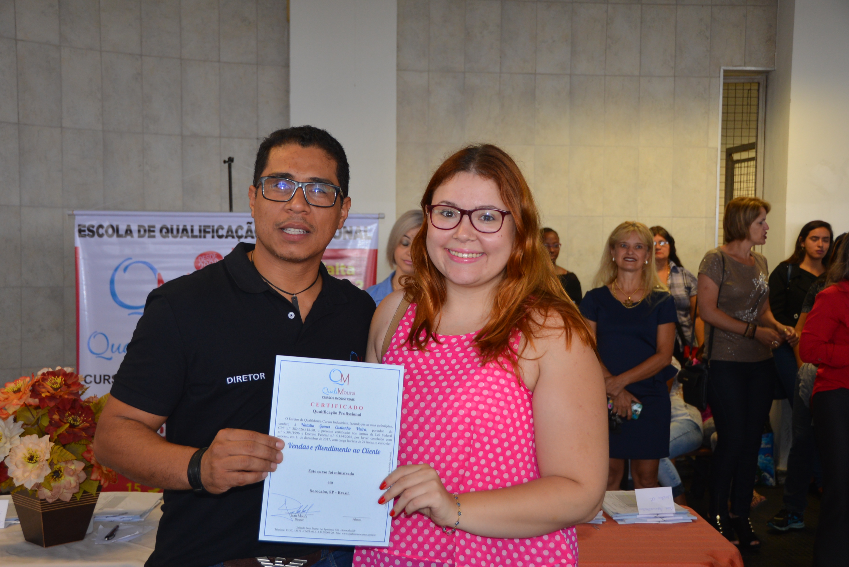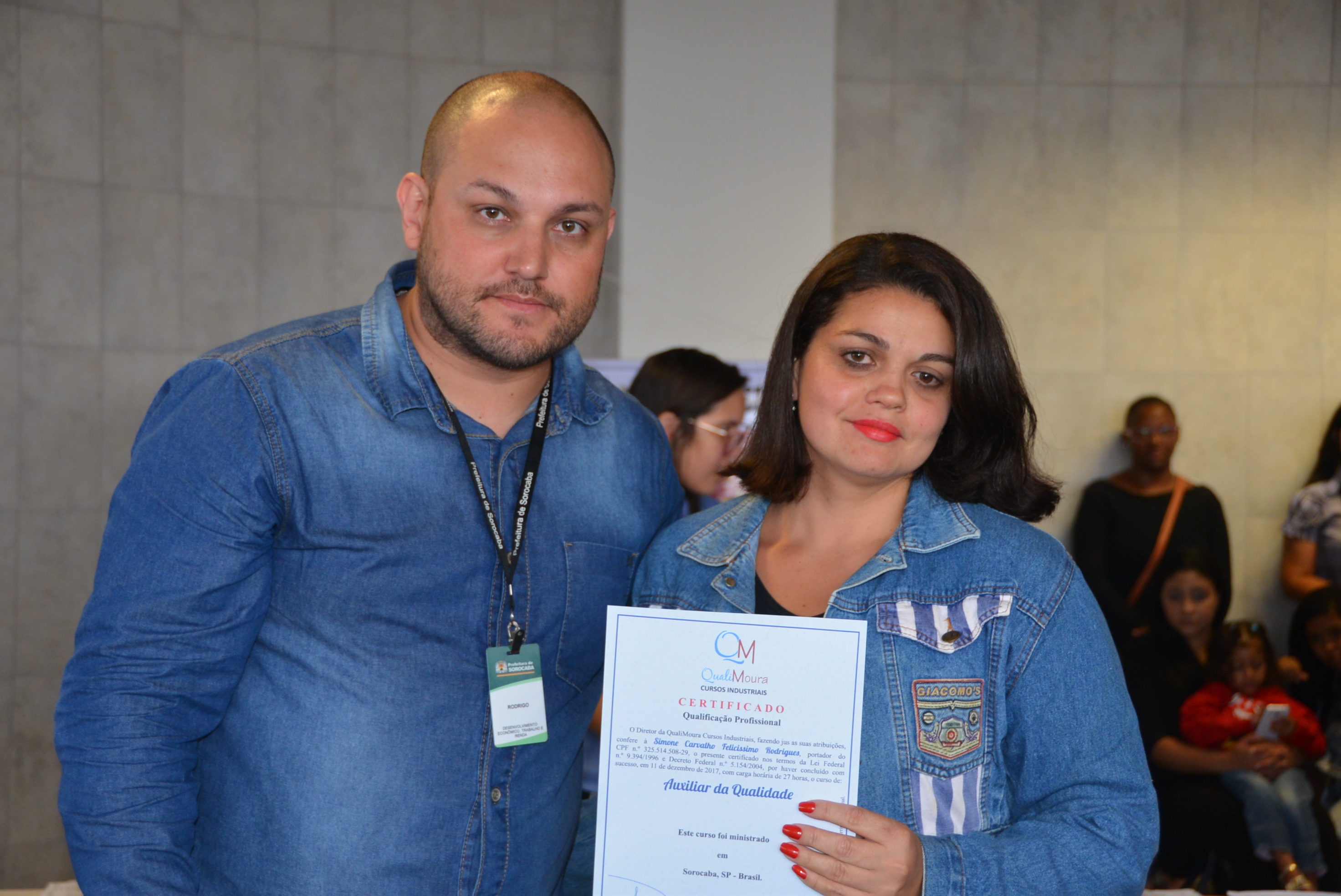 Os certificados foram entregues aos alunos dos cursos de Auxiliar Administrativo, Auxiliar em Logística, Auxiliar de Recursos Humanos, Auxiliar de Qualidade, Auxiliar de Costura, Operador de Caixa, Vendas e Atendimento ao Cliente, Segurança do Trabalho e Equipamento de Proteção Individual.