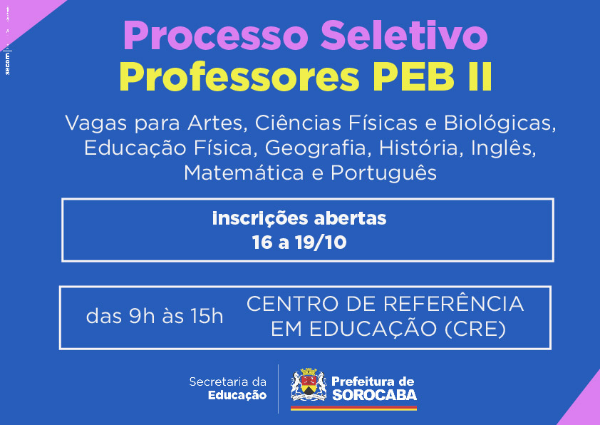 A Prefeitura de Sorocaba abrirá inscrição para o Processo Seletivo destinado à contratação para Função – Atividade de Professor de Educação Básica II para as disciplinas: Artes, Ciências Físicas e Biológicas, Educação Física, Geografia, História, Inglês, Matemática e Português, para atender o ensino fundamental da rede municipal ano letivo de 2018.