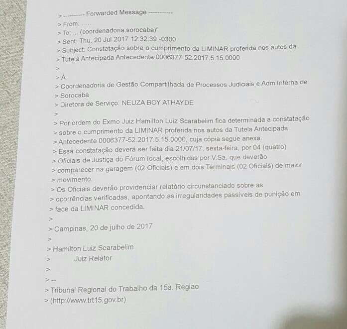 A presença dos oficiais de justiça ocorreu por determinação do juiz relator Hamilton Luiz Scarabelim, do Tribunal Regional do Trabalho (TRT) da 15ª Região. O item A da liminar, que foi concedida no dia 23 de junho e ratificada no dia 7 de julho pelo tribunal, determina que seja mantida 70% da frota de cada empresa concessionária em horários de picos (das 6h às 9h e das 17h às 20h) e 50% nos demais horários, e que a operação seja feita com ônibus das próprias concessionárias, de acordo com o Plano Operacional de Greve dos requerentes (tabela programada das linhas de ônibus), sob pena de desobediência e de multa diária de R$ 120 mil, além da aplicação das penalidades de cancelamento do registro do requerido.