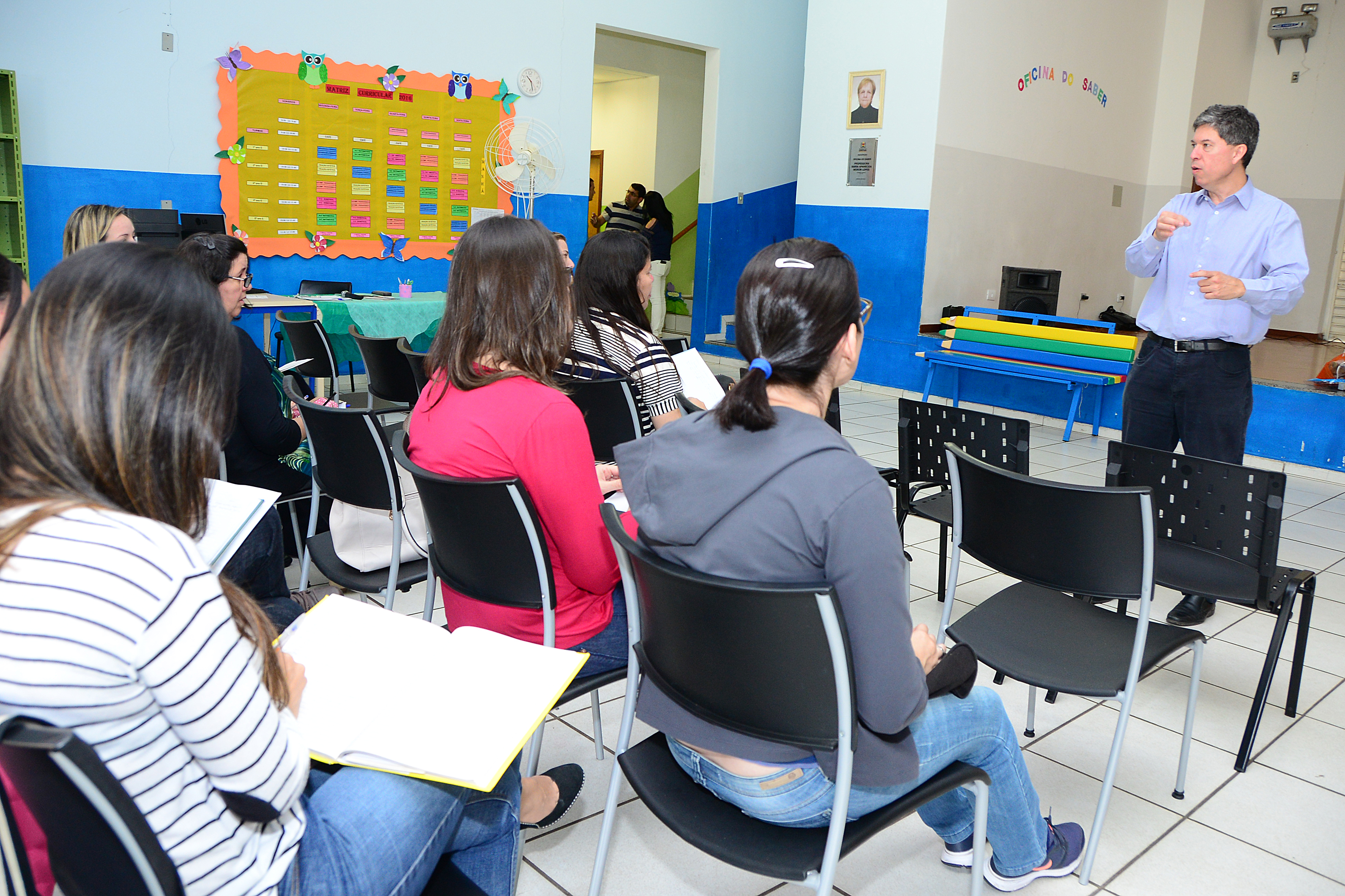 Os professores dos 4º e 5º anos da Escola de Ensino Fundamental em Tempo Integral participaram, nesta quarta-feira (28), da segunda formação promovida pela Secretaria da Educação (Sedu). Em encontro realizado na Oficina do Saber da Escola Municipal “Hélio Rosa Baldi”, no Jardim São Guilherme, eles assistiram a uma palestra sobre robótica, com o professor da Unesp, Antonio Cesar Germano Martins.