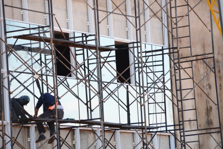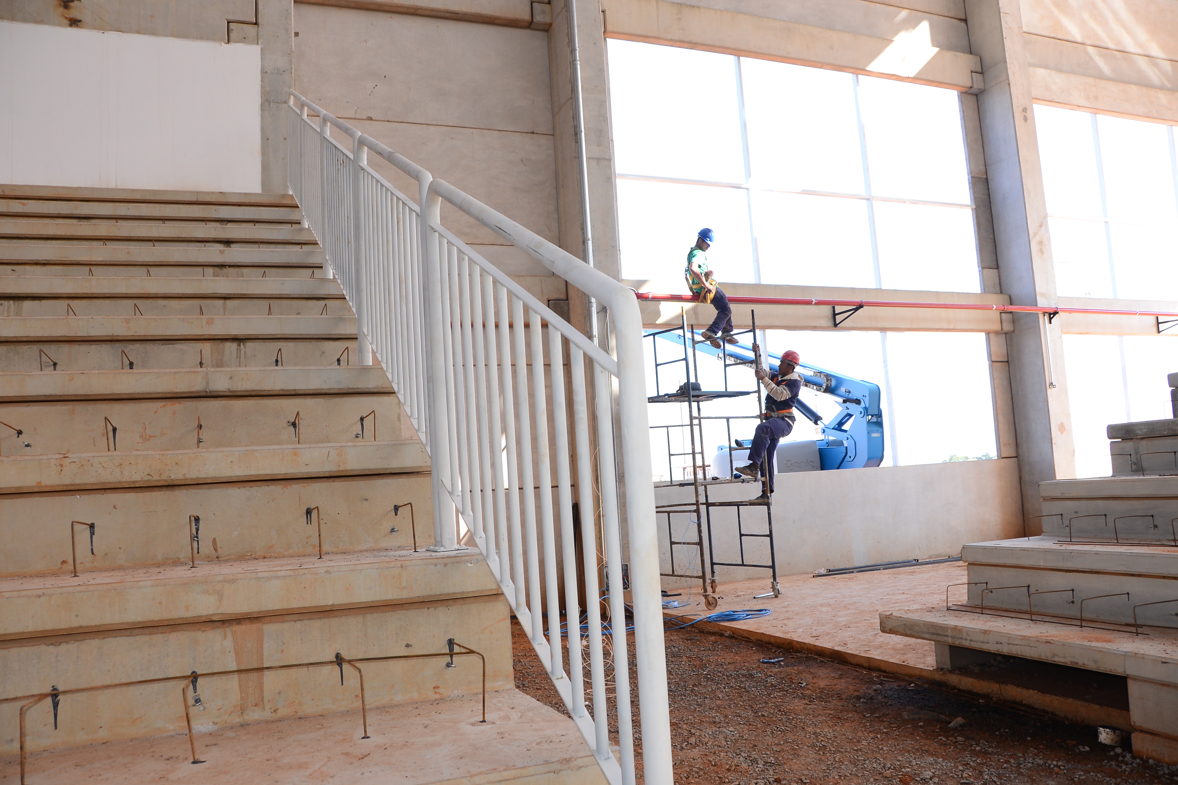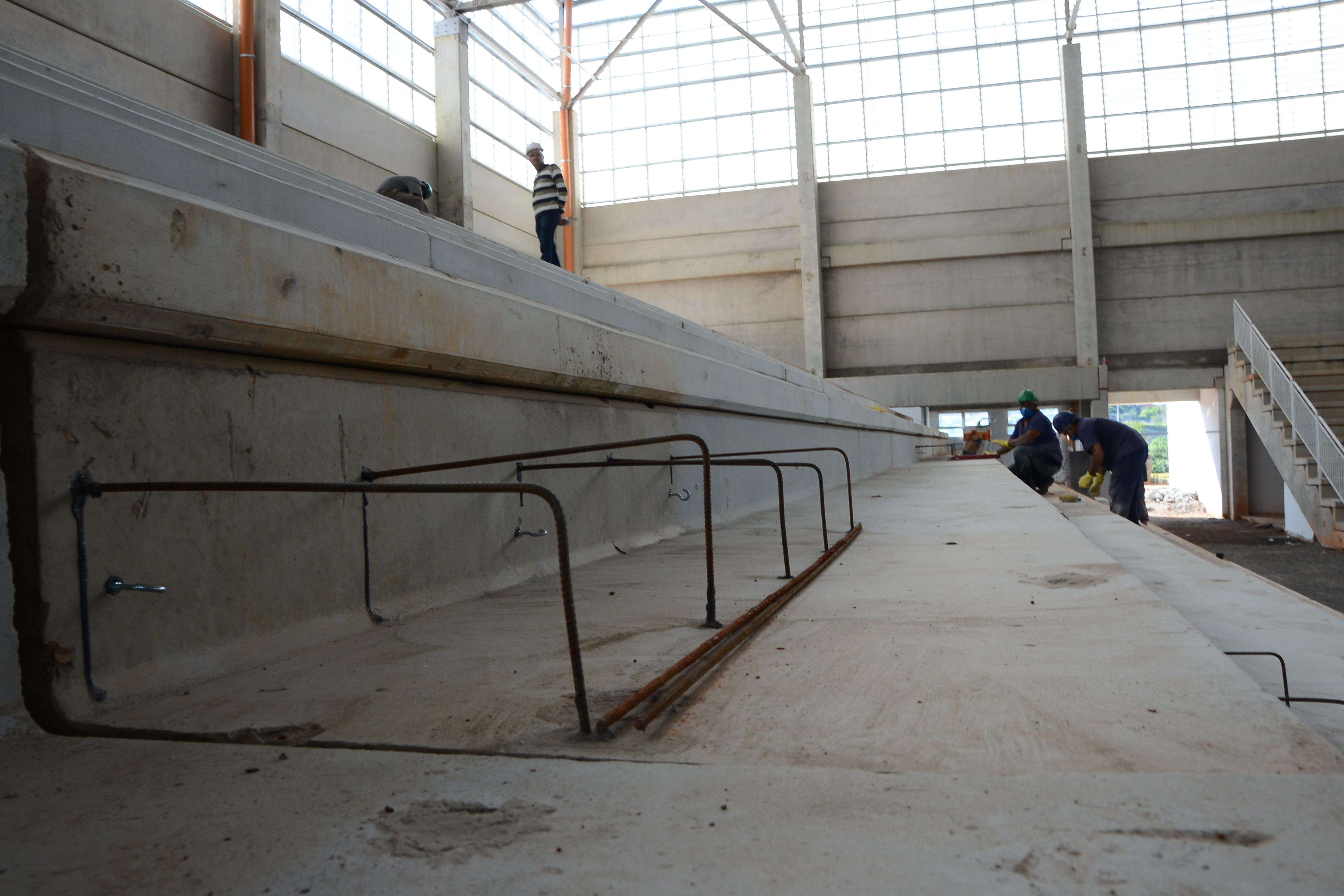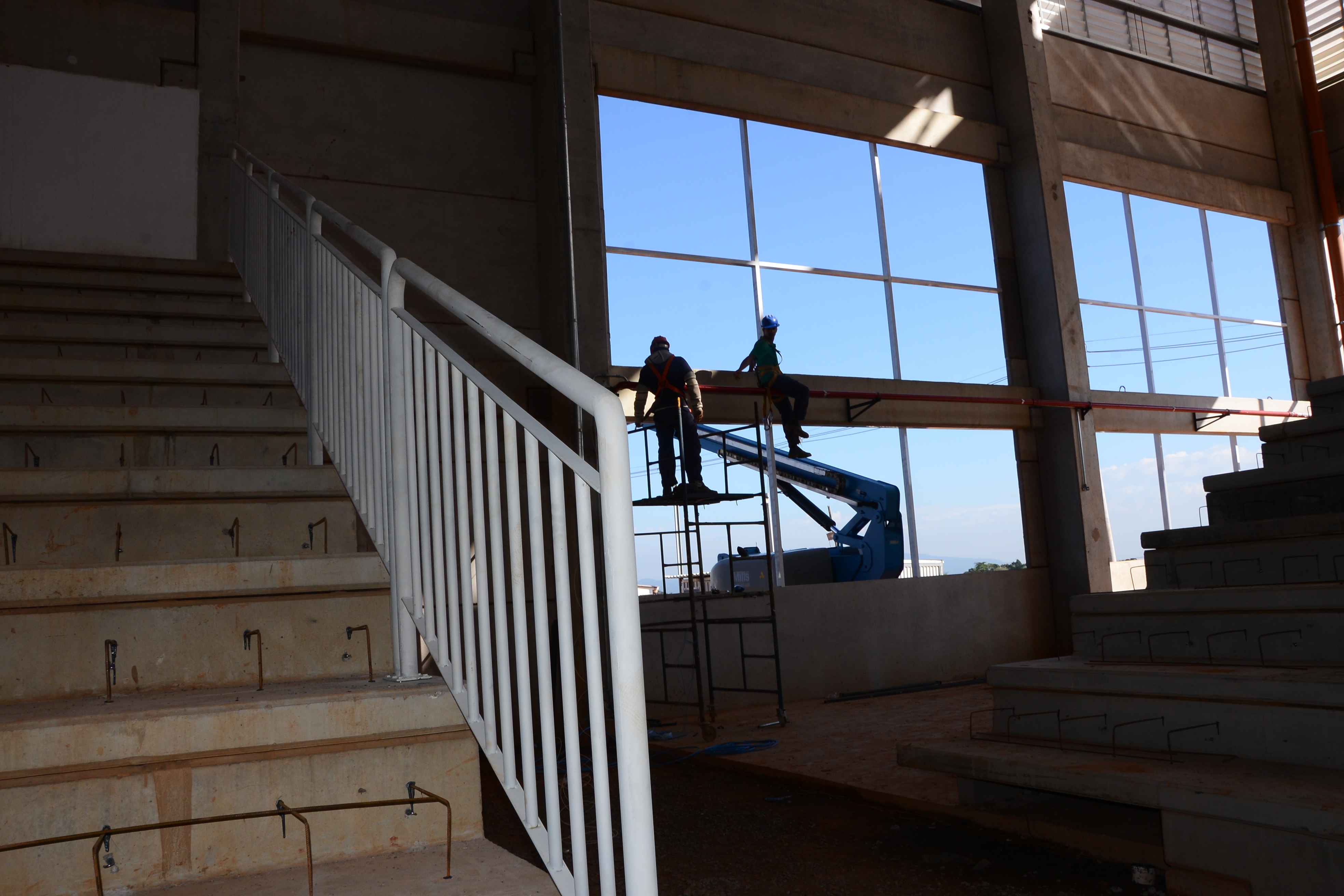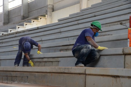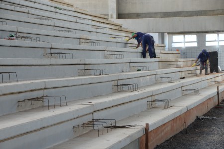 Outro serviço que estava sendo realizado era a colocação de vidros nas esquadrias de alumínio da entrada principal da Arena. No seu interior, o trabalho estava sendo realizado nas arquibancadas, onde os funcionários faziam o molde com ferro dos degraus. A capacidade é de atender até 4 mil pessoas sentadas. Ainda nas arquibancadas, em duas delas estão colocados os guarda-corpos, que servem de proteção, em função de desnível de pisos. Também serão instalados corrimãos.
