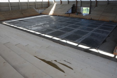A quadra poliesportiva da Arena Multiúso já está concretada e na segunda-feira (23) o mesmo serviço começa a ser feito no espaço entre a quadra e a arquibancada. A chuva deu uma trégua e os serviços externos da obra da Arena puderam ser feitos nesta sexta-feira (20). Funcionários da Progredior, empresa responsável pela obra colocavam telhas metálicas nos anexos da Arena.