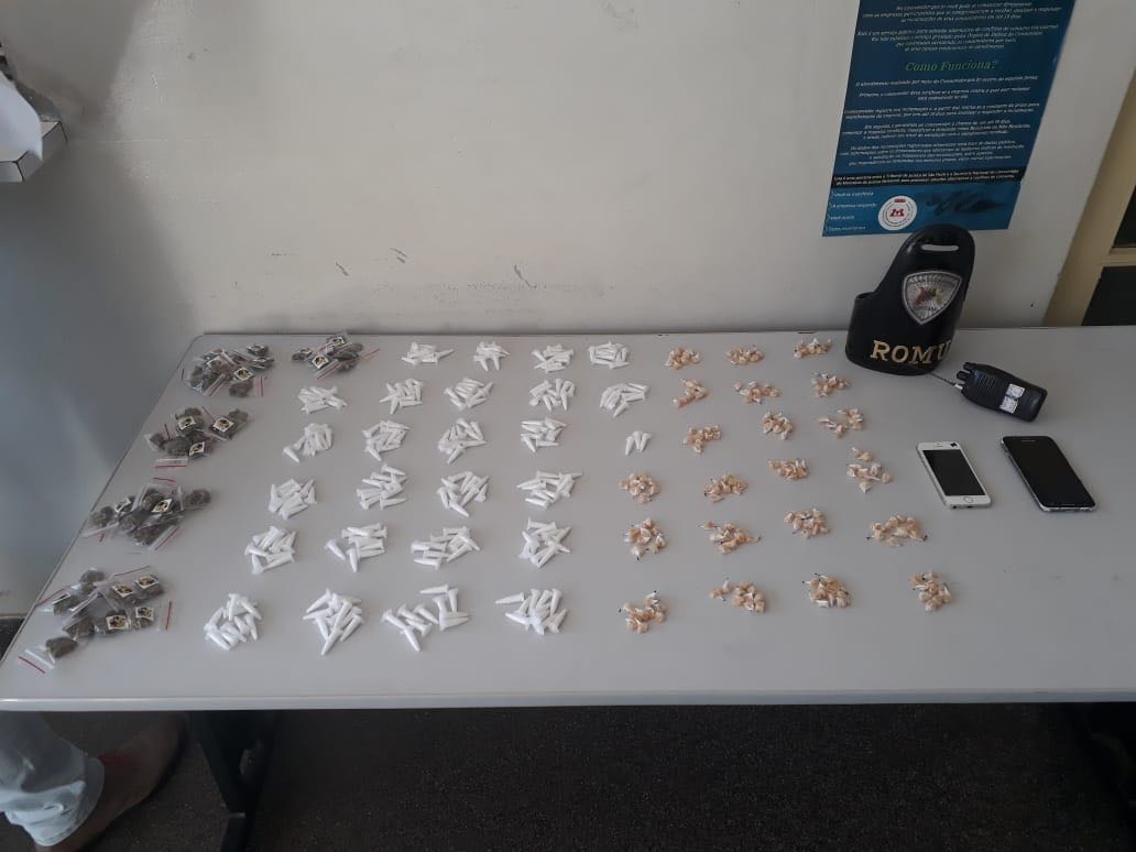 Durante busca ao interior do veículo, os GCMs encontraram a sacola com 47 porções de maconha, 253 microtubos de cocaína e 210 porções de crack.