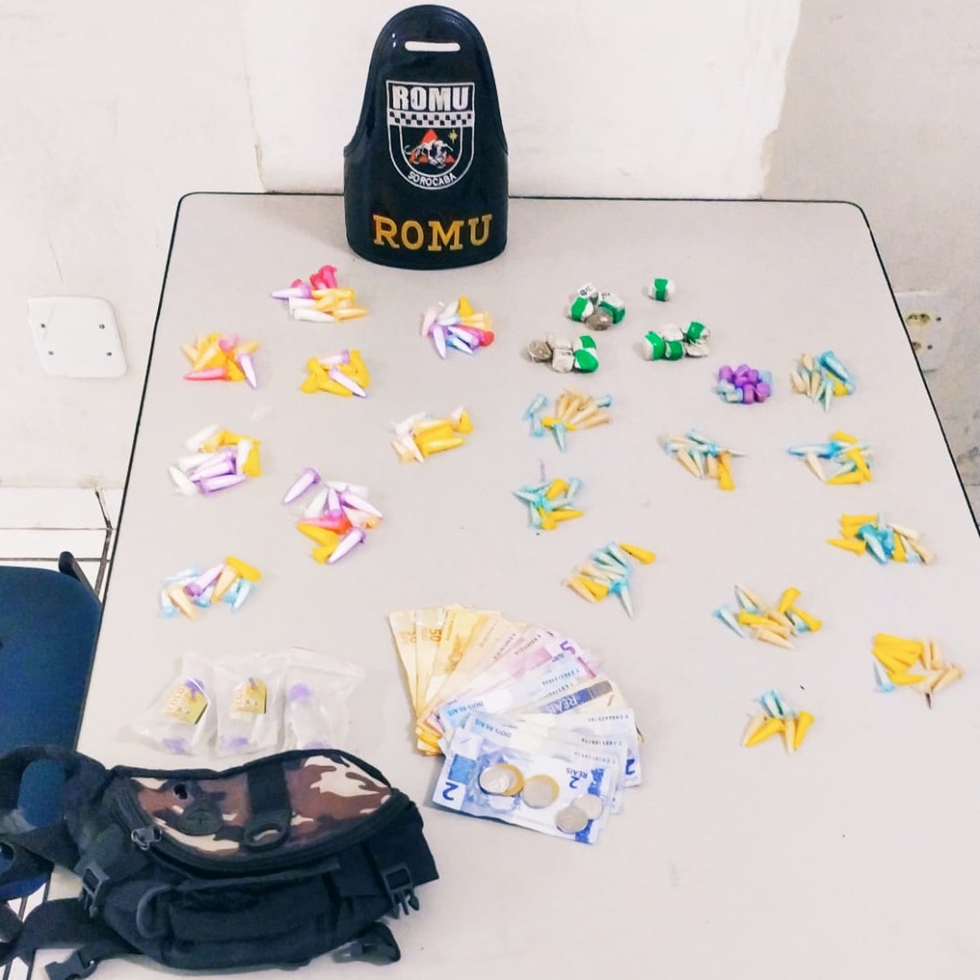 A equipe da GCM encontrou com R.M.S., de 18 anos, uma pochete contendo 3 frascos de lança perfume, 16 porções de maconha, 106 porções de crack e 81 porções de cocaína. Já com o adolescente de 17 anos, foi encontrado uma sacola plástica com R$ 198, mais 2 celulares que usuários haviam trocado por drogas.