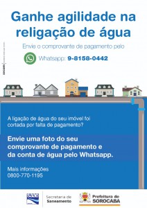 Até então, o consumidor precisava ir pessoalmente até o atendimento do Saae-Sorocaba para apresentar o comprovante pago, aguardar que o banco informasse sobre o pagamento ou enviar o comprovante por e-mail, para o endereço religacao@saaesorocaba.sp.gov.br. Ainda é possível encaminhar pelo e-mail, no entanto o novo aplicativo adotado (WhatsApp) é mais ágil e imediatamente o consumidor tem a confirmação se está tudo de acordo para a religação.