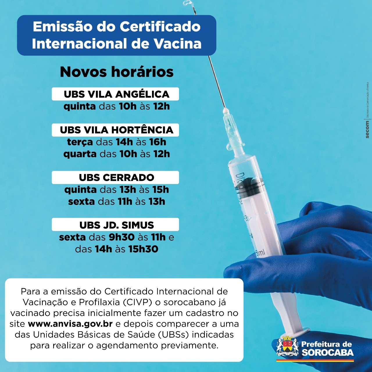Em Sorocaba, quatro Unidades Básicas de Saúde (UBSs) emitem o Certificado Internacional de Vacinação e Profilaxia (CIVP) à população. A agenda é oferecida de terça a sexta-feira.