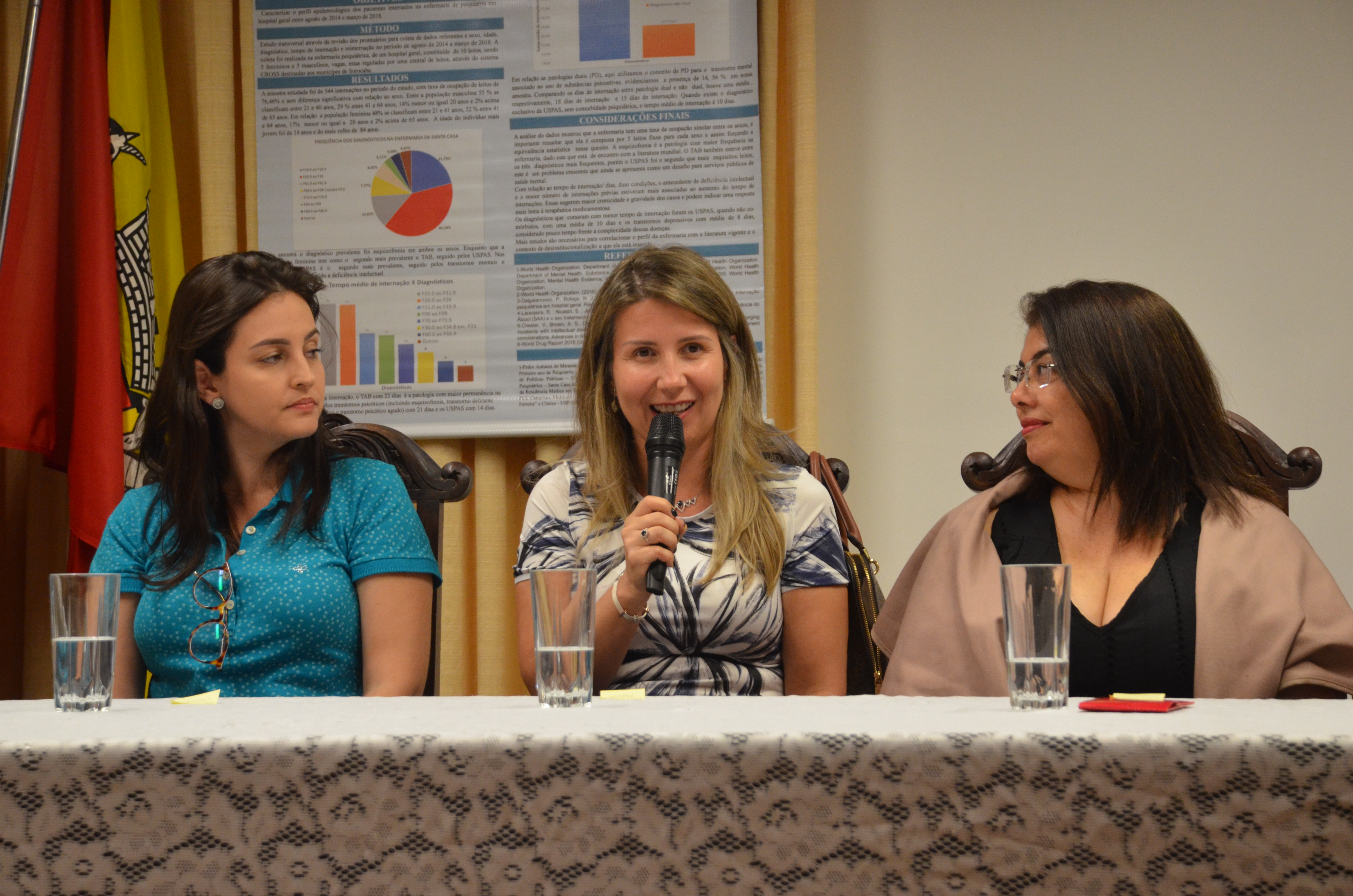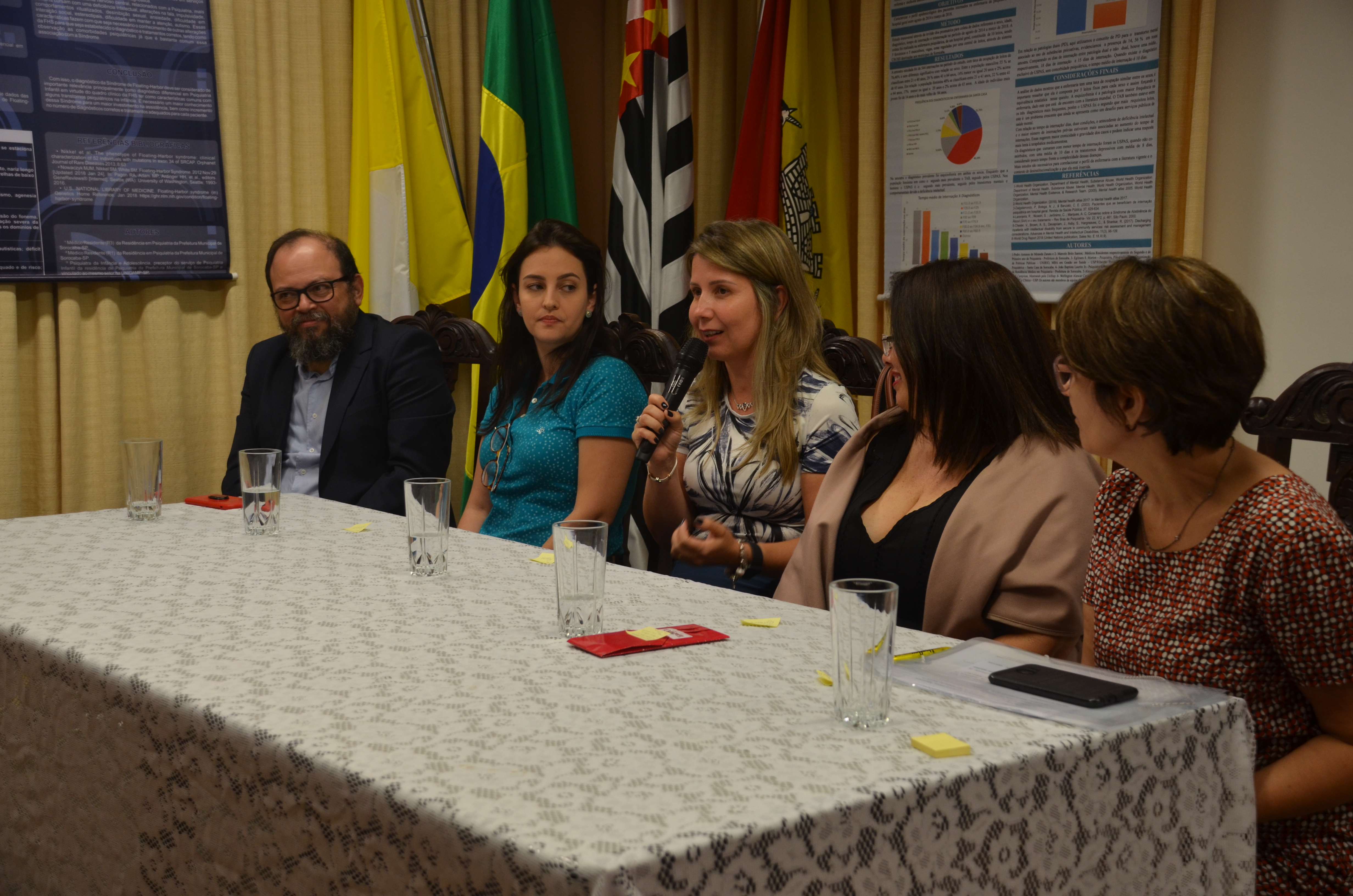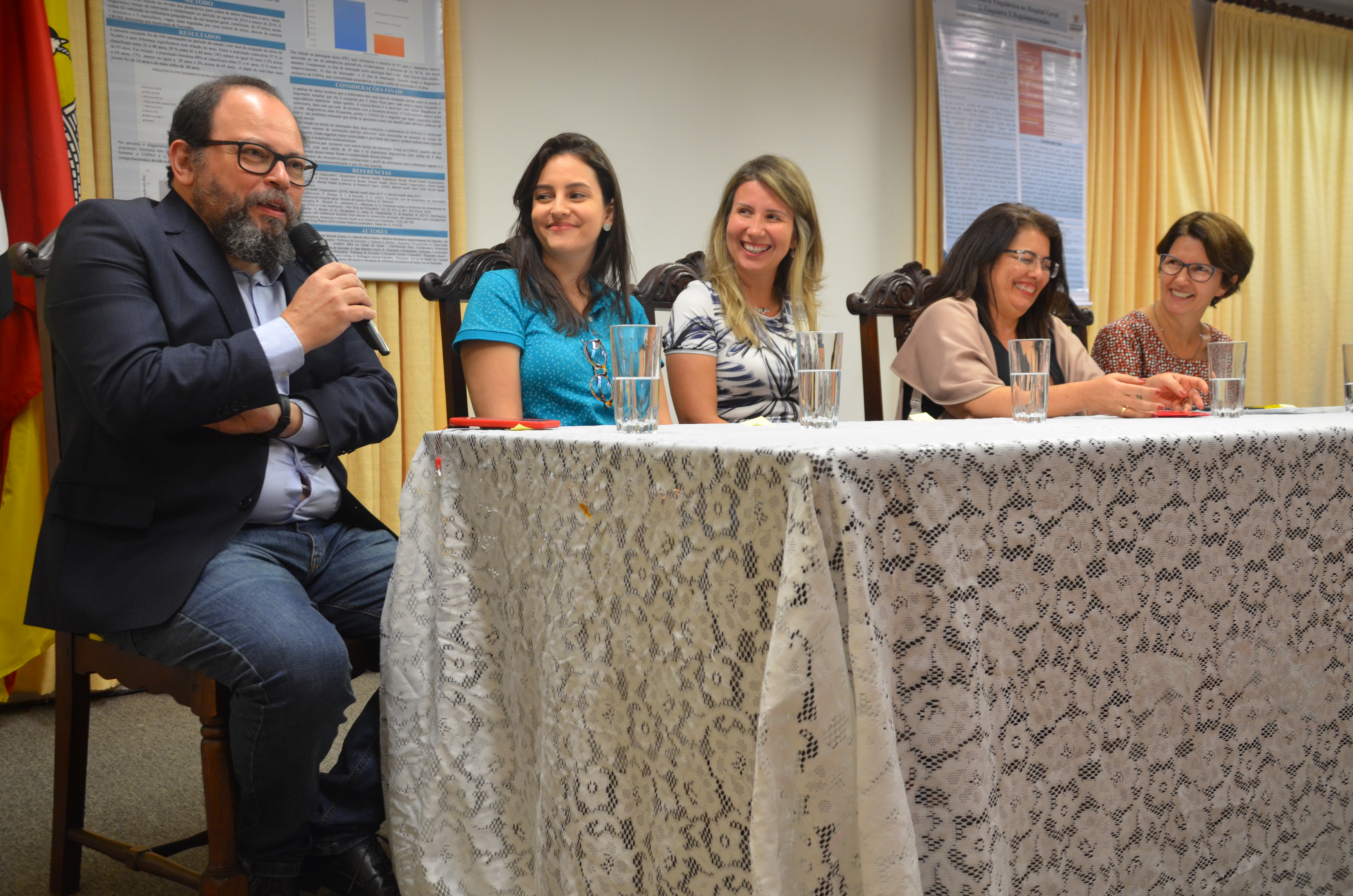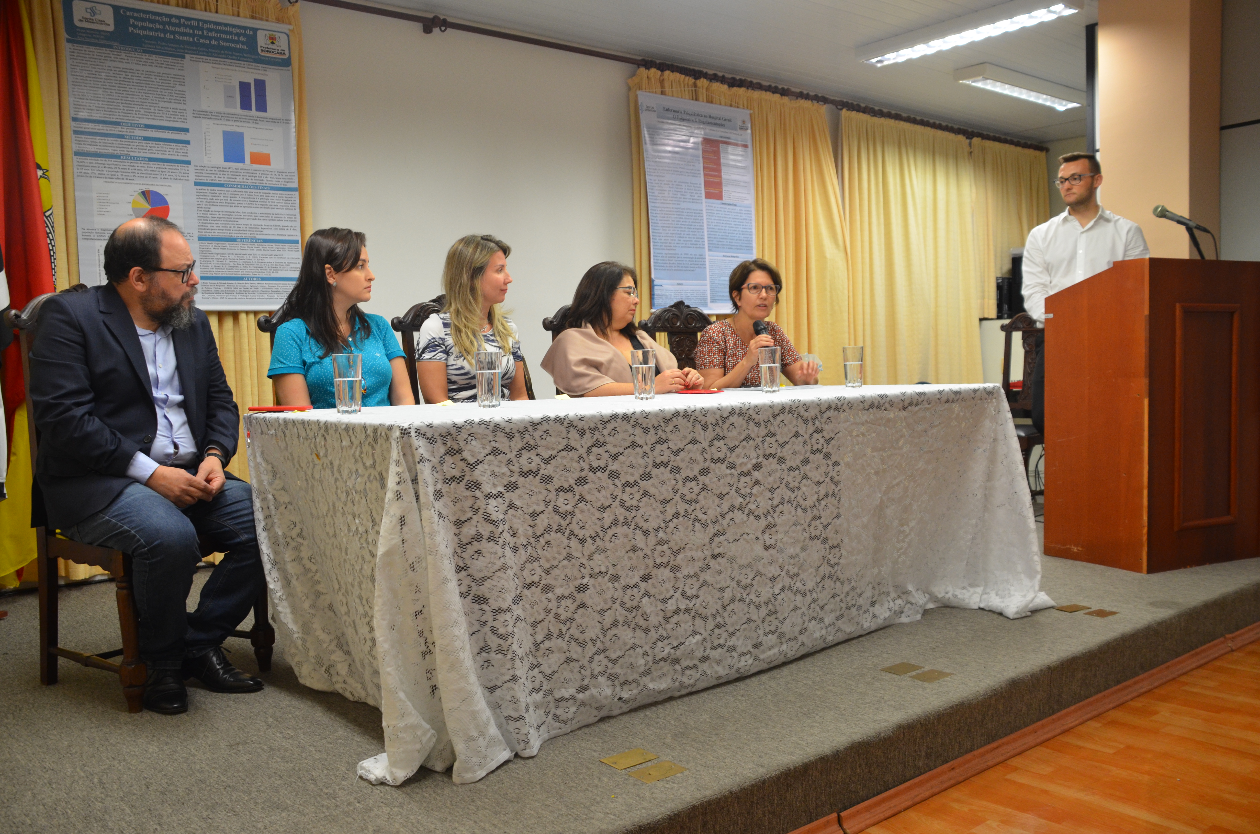 Durante o evento, uma mesa foi composta com o psicanalista e psiquiatra da enfermaria de psiquiatria da Santa Casa e coordenador do Programa de Residência Médica em Psiquiatria, João Baptista Laurito Jr; a médica da Divisão de Educação em Saúde da SES e coordenadora da Comissão de Residência Médica- COREME e do Programa de Residência de Medicina de Família e Comunidade, Liliane Maria Guimarães de Pinho; a psiquiatra e chefe da enfermaria de psiquiatria da Santa Casa, Eglinara Silva Morton; a psicóloga e supervisora da Divisão de Educação em Saúde da SES, Camila Maria de Almeida Lima; além da secretária da Saúde, Dra. Marina Elaine Pereira.