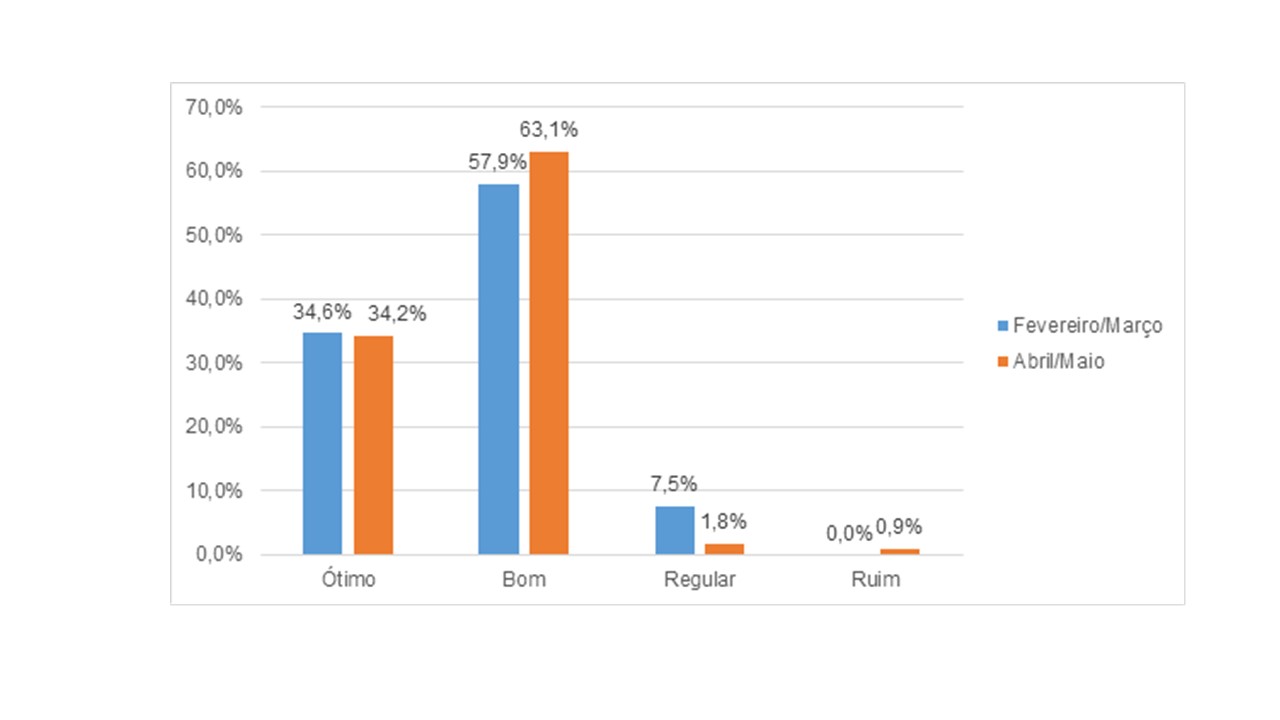O gráfico (anexo) demonstra significativa aprovação, na média, entre os meses de fevereiro a maio de 2017, com 34,2% considerando ótimo e 63,1% Bom, comprovando assim a aceitabilidade desta avaliação que utilizou um questionário semiestruturado entregue em todas as unidades escolares.