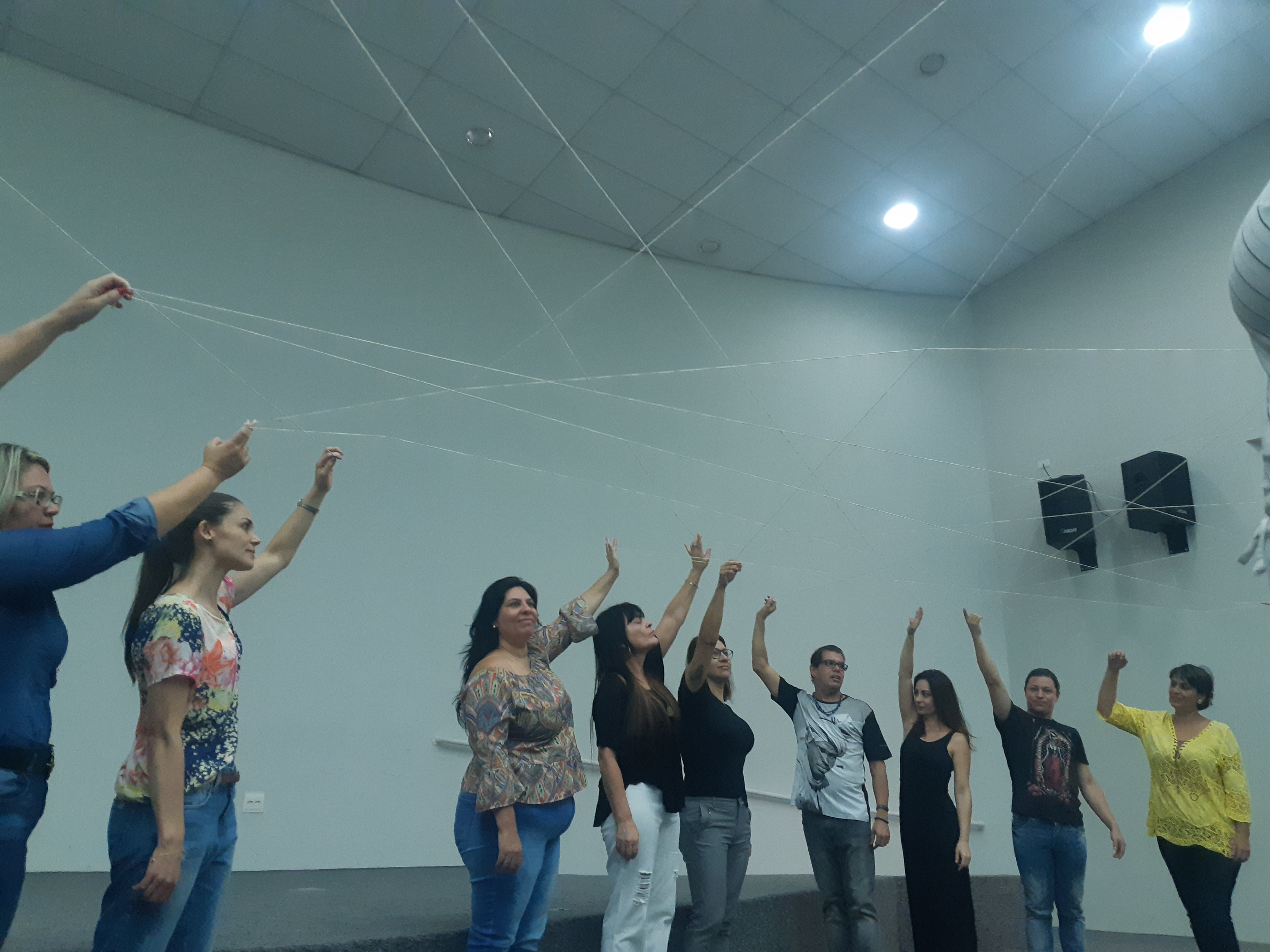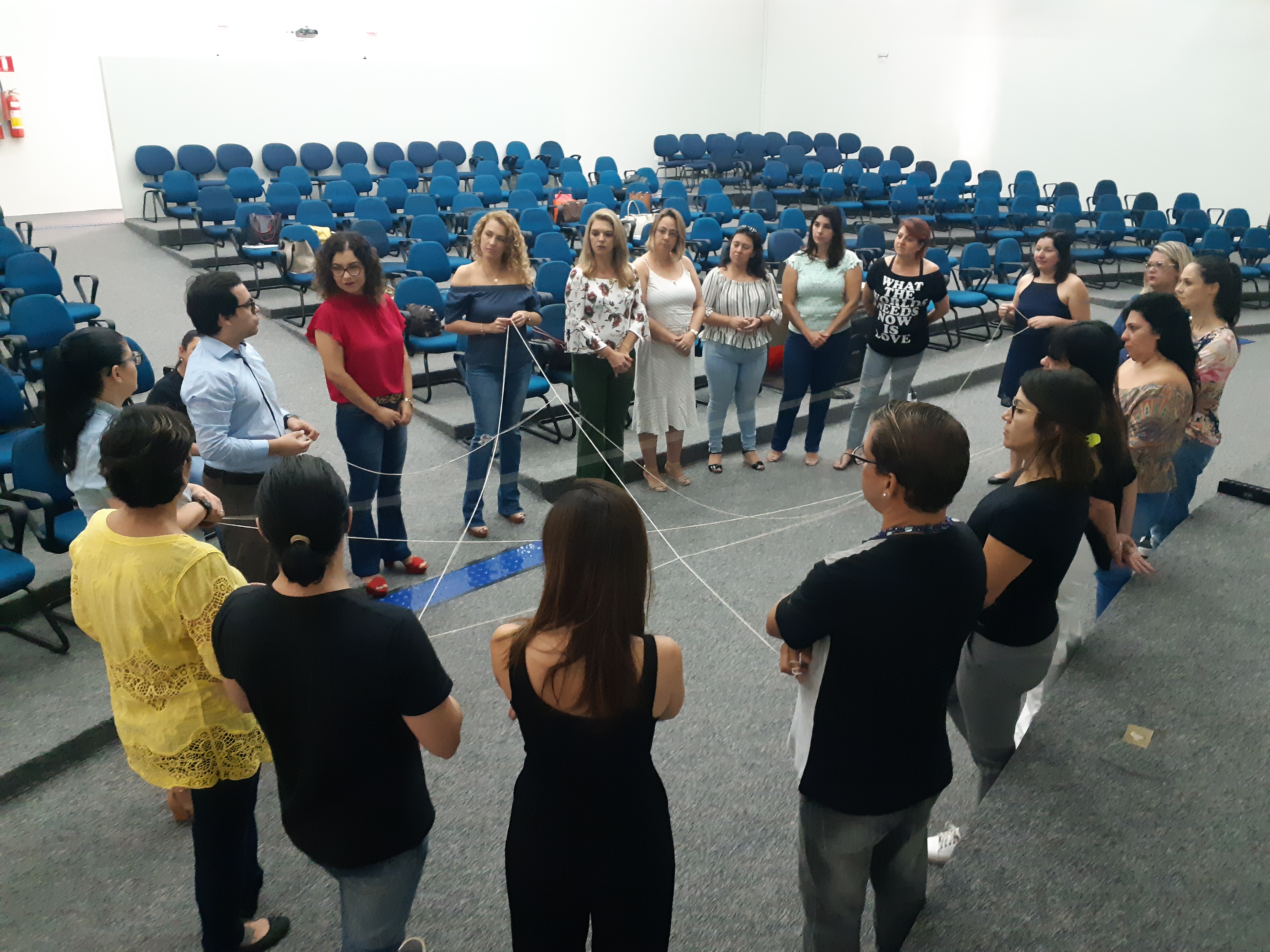 Uma orientadora pedagógica segura mais uma ponta do barbante no círculo e relata: “Eu me incomodo de ver os banheiros nas escolas separados por cores azul e rosa, mas é difícil quebrar essa sequência normatizada na sociedade”.