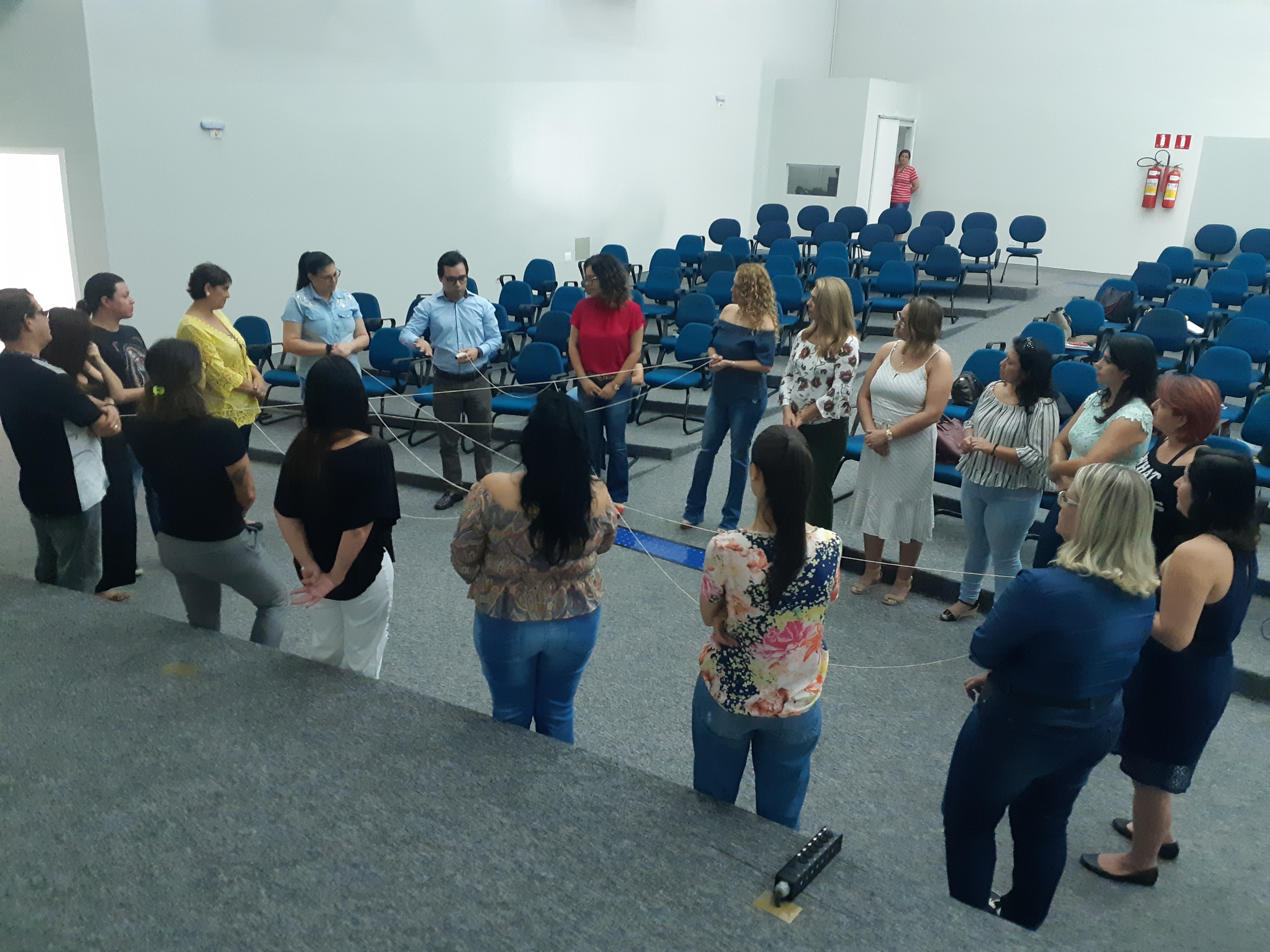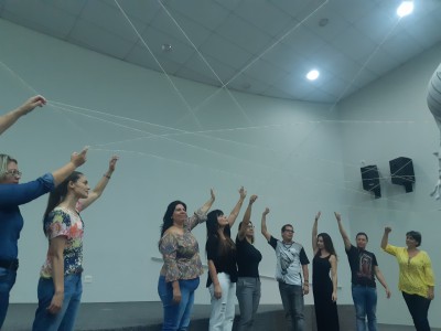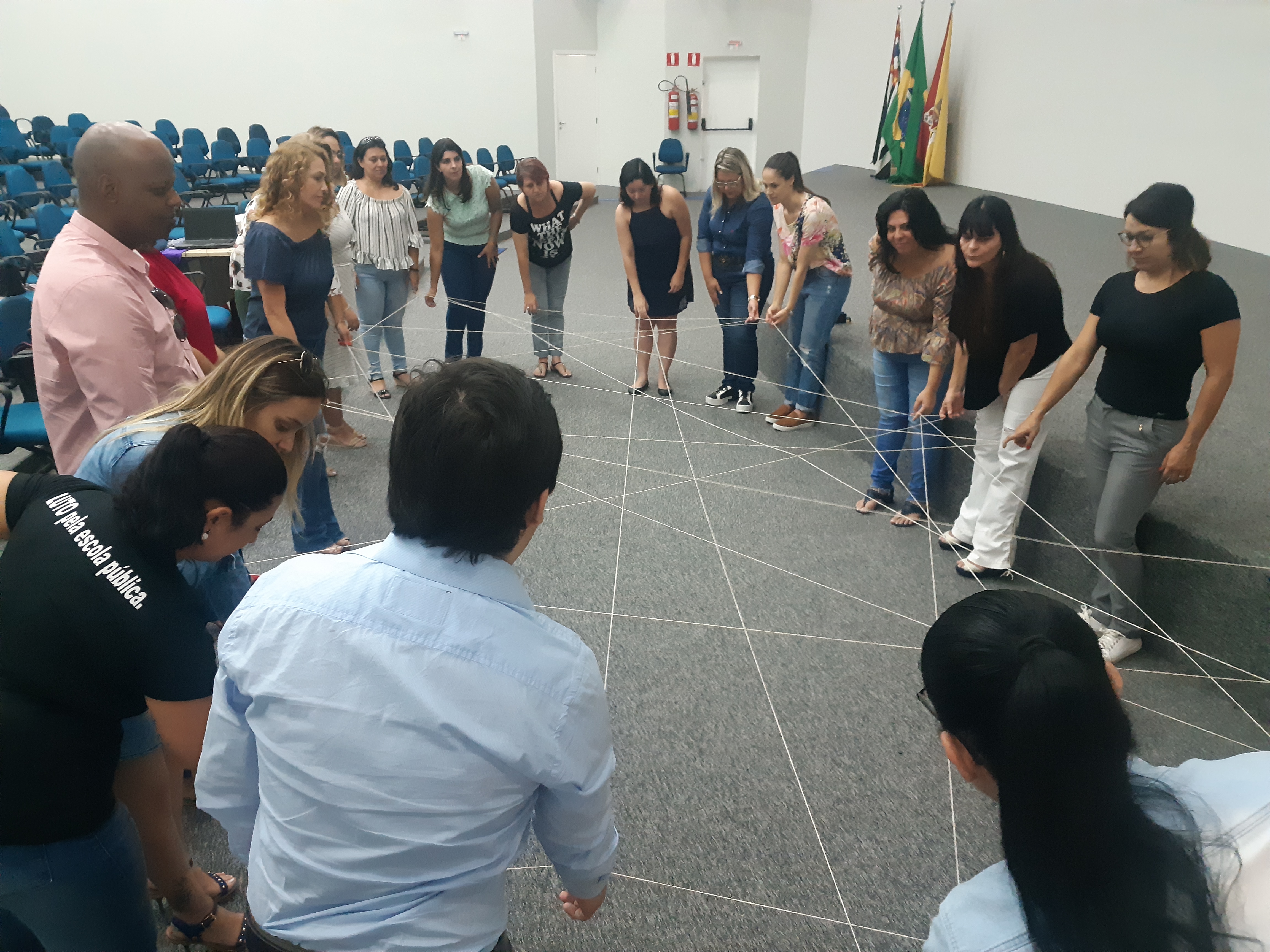 Depois que o barbante está cruzado no círculo de debate, que todos os gestores falaram, entra em cena Luiz Fábio Santos, supervisor de ensino da rede municipal de educação de Sorocaba, mestre em Educação, que vai ministrar o curso. Luiz traz um pensamento de Paulo Freire para explicar a dinâmica do barbante. “Cada ponto de vista é um ponto”. O supervisor de ensino se refere ao olhar de cada pessoa, que é único, mas depende do ponto de vista para mudar ou ampliar a visão.