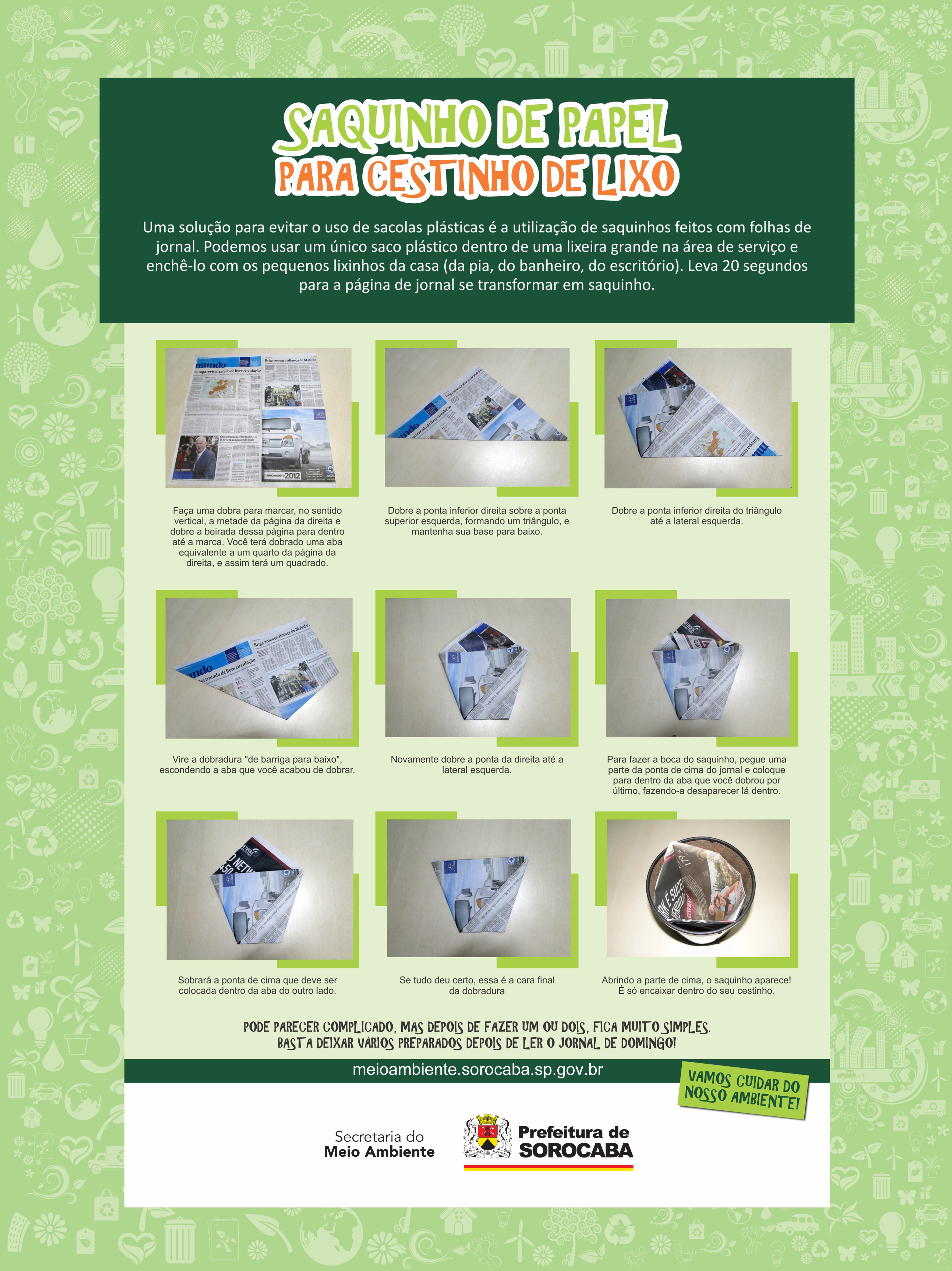 Na segunda-feira (dia 30), das 9h às 16h, ocorrem oficinas demonstrativas de como reaproveitar materiais descartáveis. Na ocasião, o público vai aprender como utilizar jornal para fazer saquinho para cesto de lixo e filtro de café, para decorar porta-retratos e caixinhas. A ação é aberta ao público e será executada no andar térreo do Paço Municipal, no Alto da Boa Vista. Não é necessário se inscrever.
