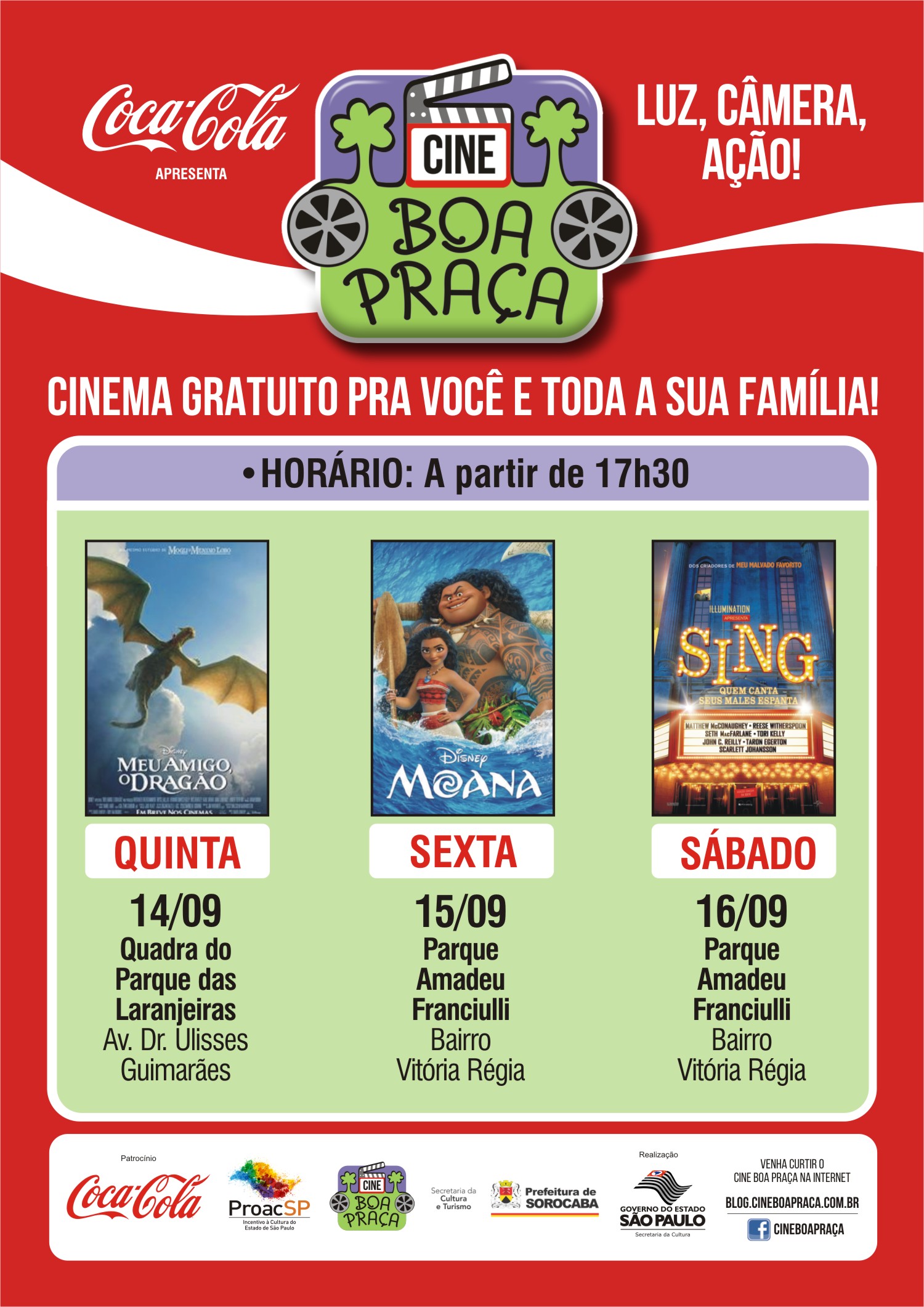 Em Sorocaba a primeira sessão do cinema itinerante será a partir das 17h30, na quadra do Parque Laranjeiras, e segue no mês de setembro com mais cinco dias de exibições em mais dois bairros do município. Os filmes que serão exibidos são: Moana: Um Mar de Aventuras; Meu Amigo – O Dragão e SING – Quem Canta seus Males Espanta.