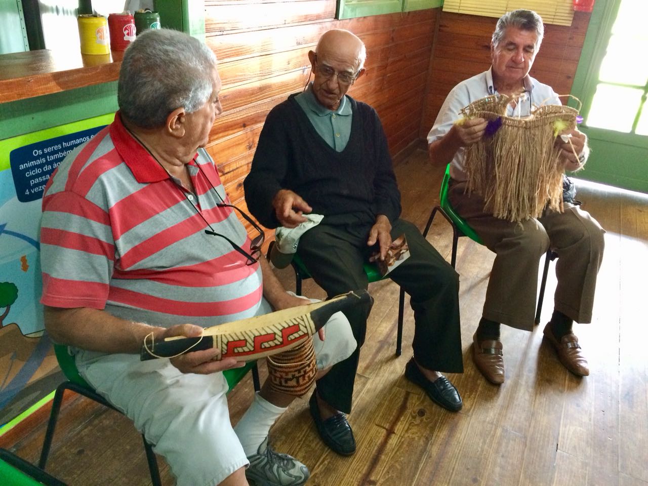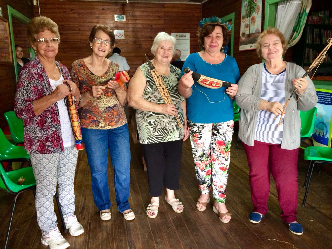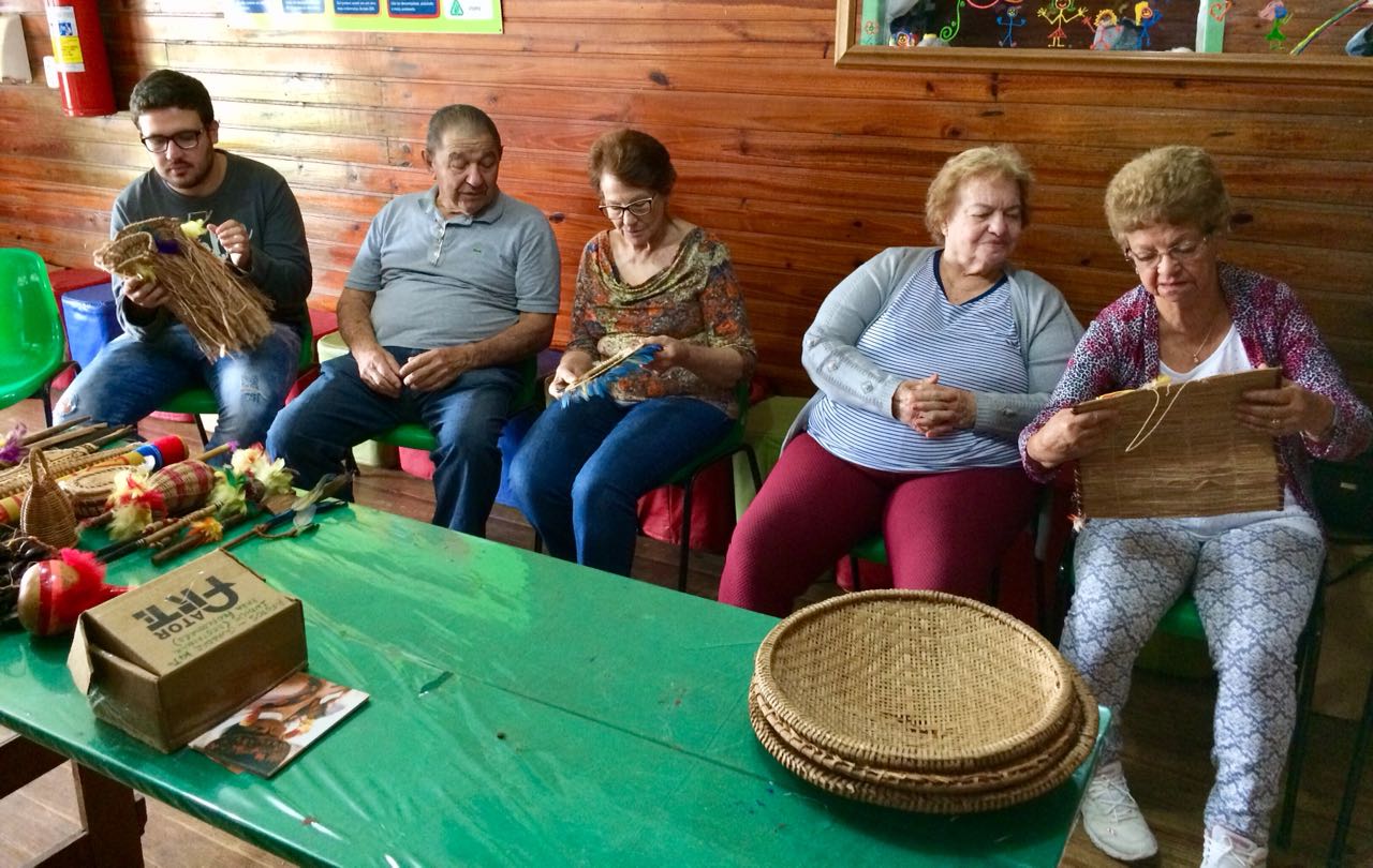 Para começar, a terceira idade participou de um bate-papo sobre a cultura indígena e ainda puderam manusear alguns utensílios e instrumentos, como cestos, arco e flecha, facas e instrumentos musicais.