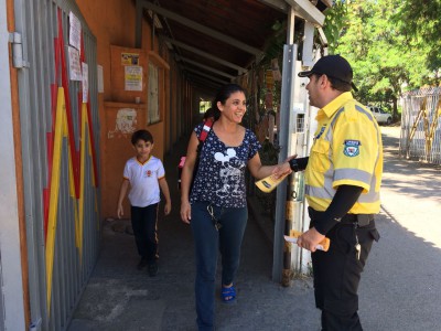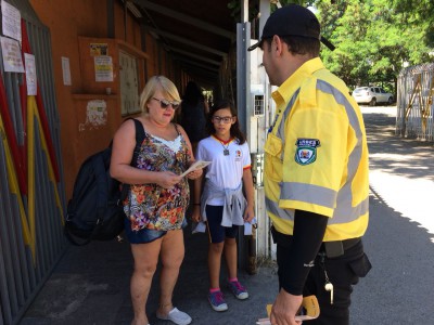 Durante a atividade, na entrada e saída dos alunos, a equipe de Educação para o Trânsito distribuiu um material educativo e conversou com os pais e responsáveis.